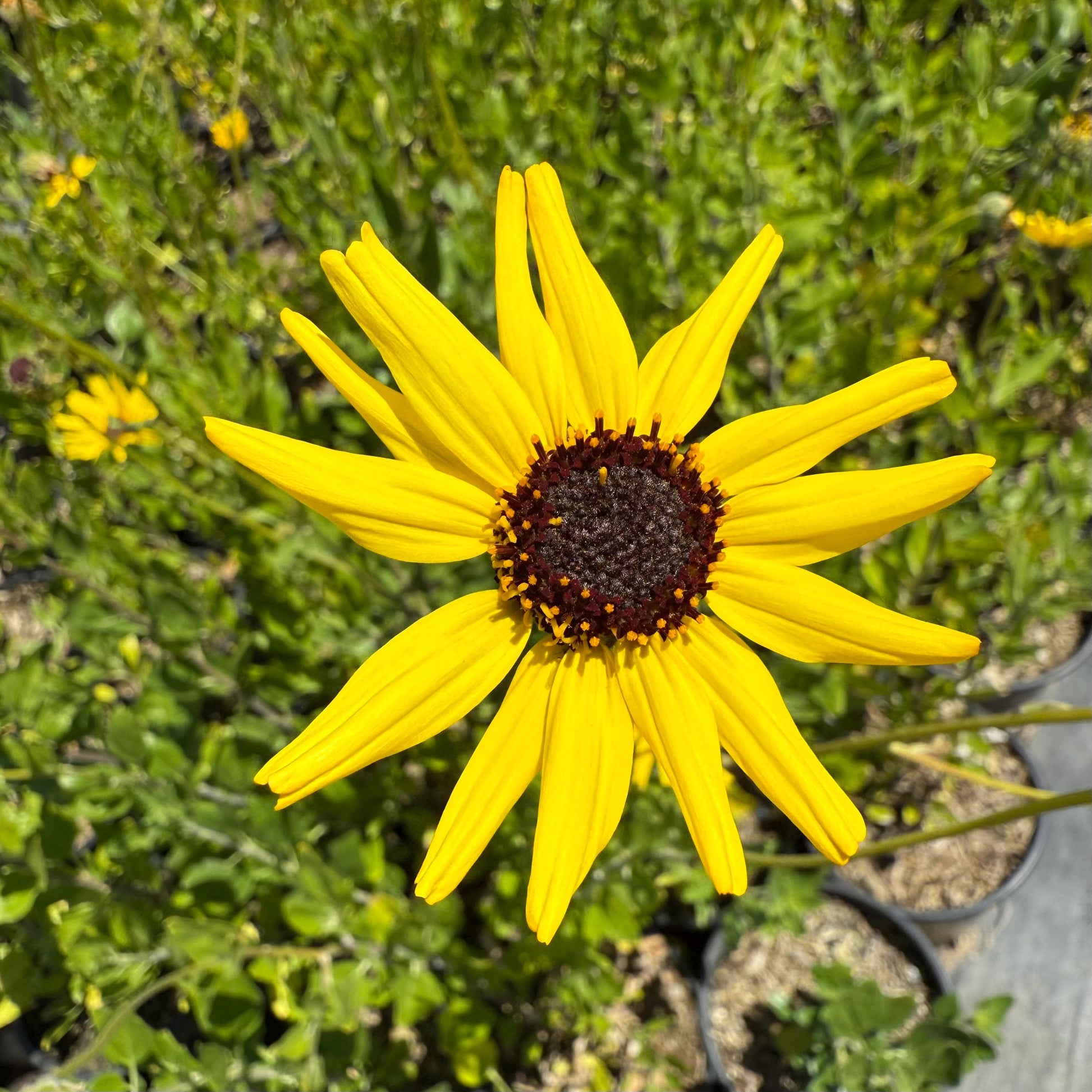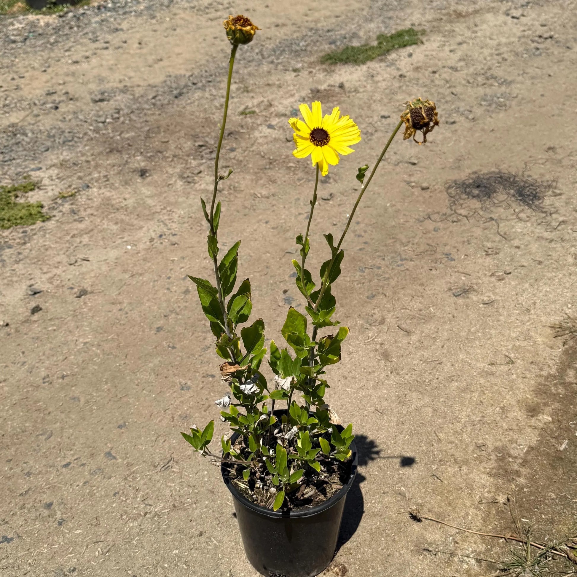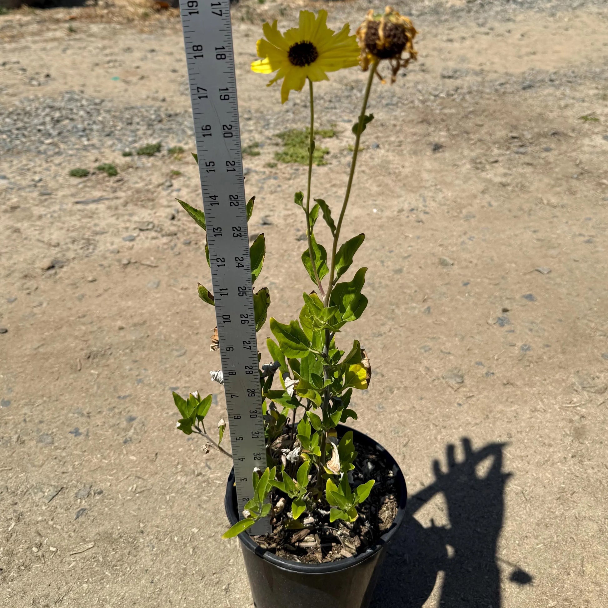California Brittlebush (Encelia californica), also known as Bush Sunflower, is a fast-growing, drought-tolerant shrub featuring brittle, branching stems and bright green, diamond-shaped leaves. It typically reaches 2 to 5 feet tall and 3 to 7 feet wide, forming a rounded, bushy shape. Thriving in full sun and well-drained soil, it requires minimal water once established. From late winter through early summer, it produces daisy-like yellow flowers with dark centers that attract bees, butterflies, and birds. This low-maintenance plant is ideal for erosion control, wildlife gardens, and as a colorful groundcover. Hardy in USDA Zones 9–10.