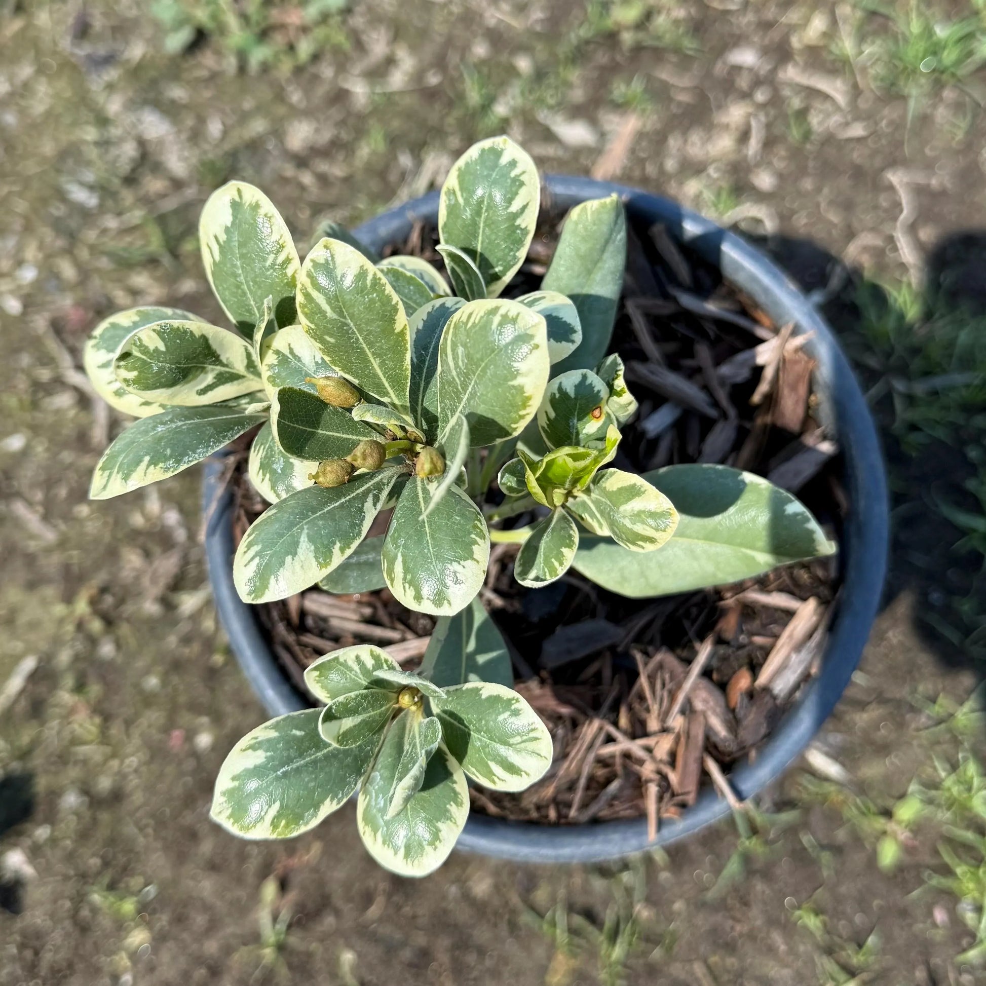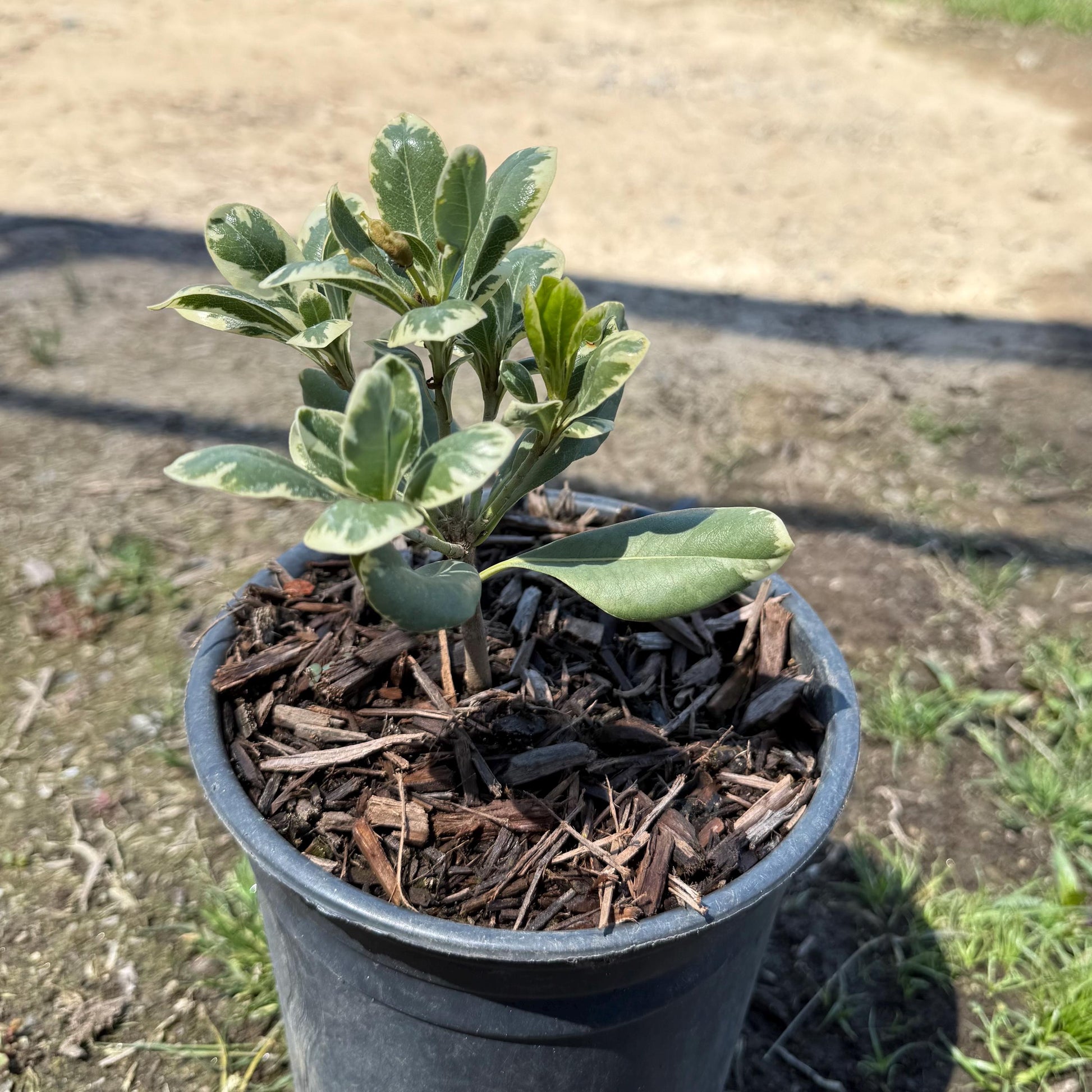 The Cream De Mint™ Dwarf Pittosporum (Pittosporum tobira ‘Shima’) is a compact evergreen shrub featuring mint green leaves edged in creamy white, with new growth emerging golden-green in spring. This slow-growing plant reaches 24 to 30 inches in height and width, making it ideal for low hedges, borders, or container plantings. It thrives in full sun to partial shade and prefers well-drained soil, requiring moderate watering—allow the soil to dry slightly between waterings. In spring, it produces small, fragrant white flowers, though it’s primarily valued for its attractive foliage. Hardy in USDA Zones 8–11.