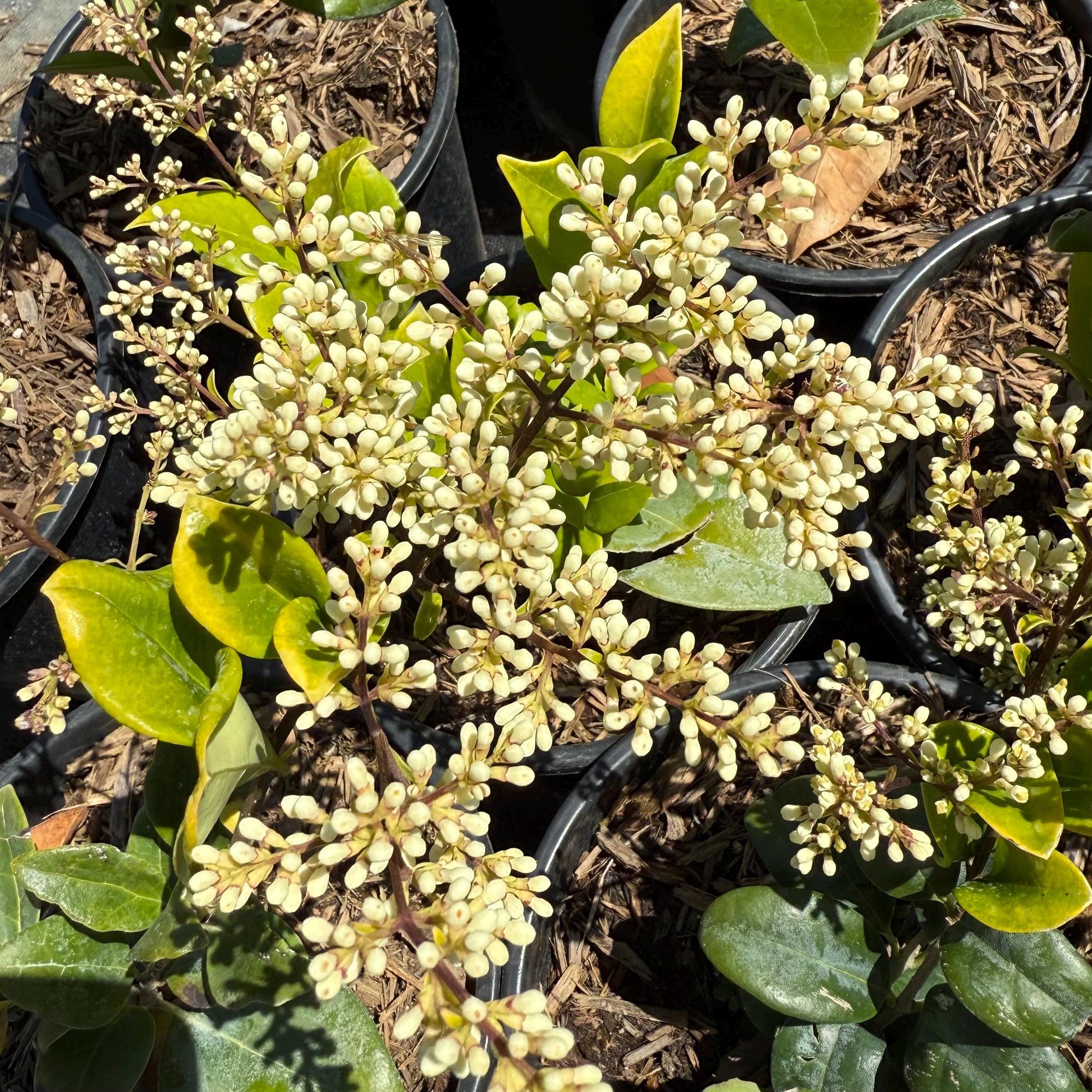 Wax Leaf Privet (Ligustrum japonicum) is a fast-growing evergreen shrub with dense, glossy dark green leaves and an upright, compact form. It typically reaches 8 to 12 feet tall and 4 to 6 feet wide, making it ideal for hedges, screens, or topiary. Thriving in full sun to partial shade, it prefers well-drained soil and is drought-tolerant once established. In late spring to early summer, it produces clusters of small, creamy-white flowers, followed by blue-black berries that attract birds. Hardy in USDA Zones 7a–10b.