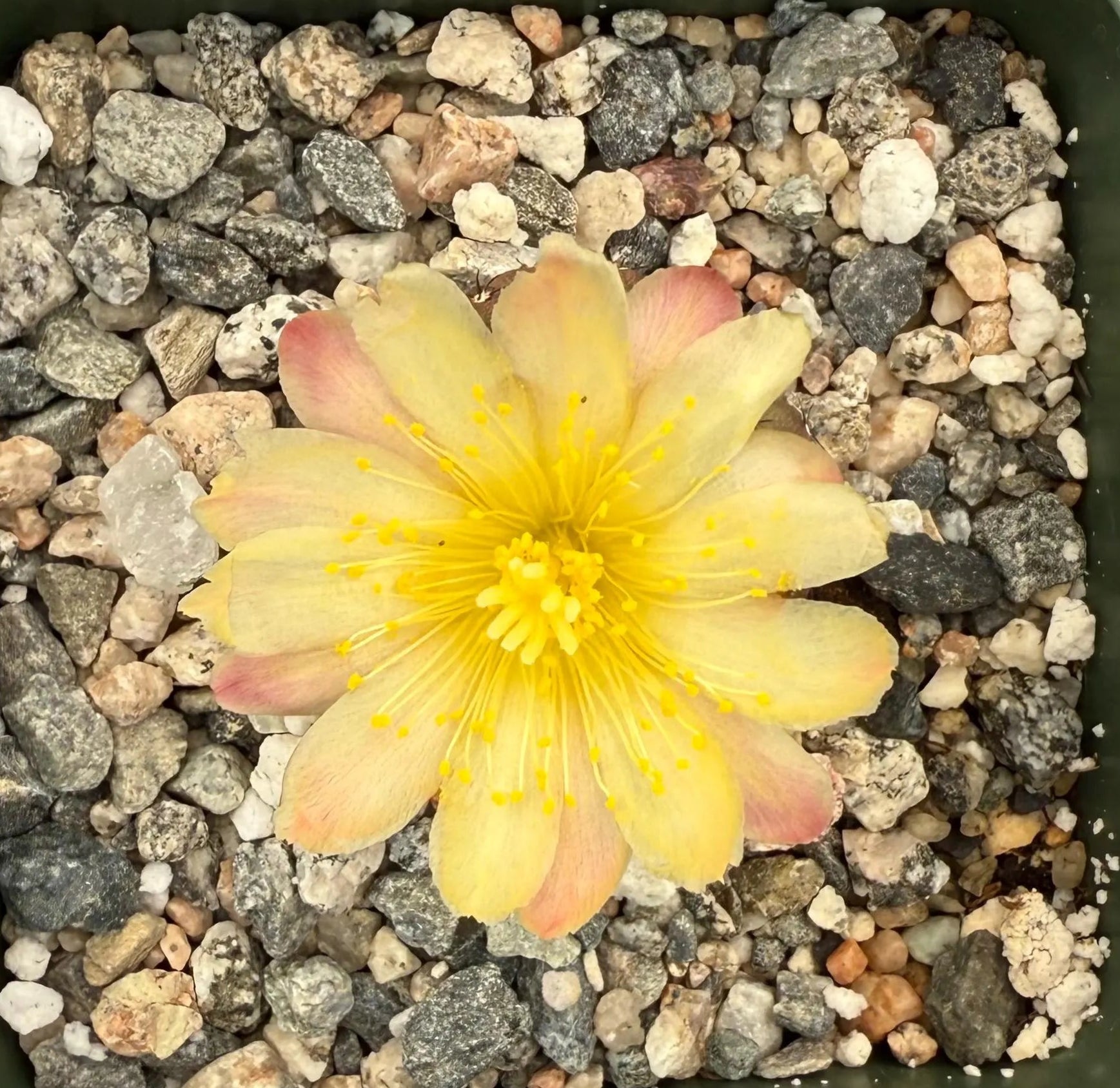 Copiapoa hypogaea var. barquitensis is a unique cactus renowned for its subterranean growth habit, featuring a gray-brown to bronze, depressed-globose stem measuring 1.2 to 2.8 inches (3 to 7 cm) in diameter, with 10 to 14 ribs divided into low, spiraled tubercles. Typically, it remains nearly sunken in the ground, with the stem’s top surface barely protruding. Native to coastal regions near Chañaral in northern Chile, this cactus thrives in full sun and requires minimal watering, making it suitable for cultivation in USDA Hardiness Zones 9a to 11.