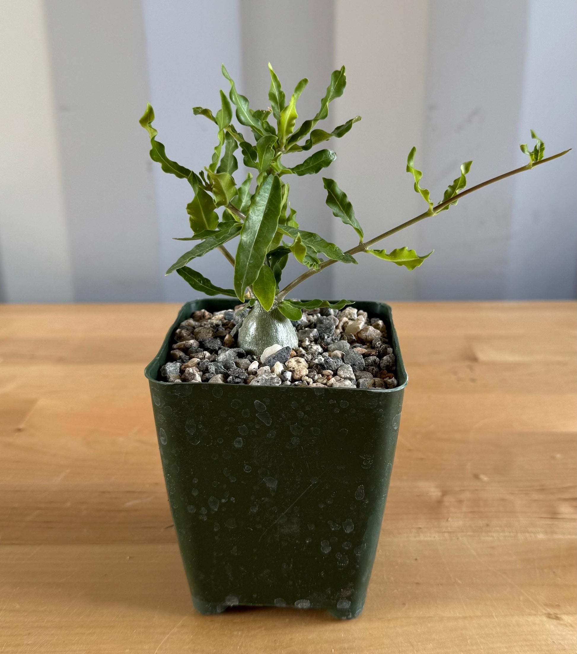 The Fockea edulis is a fascinating caudiciform succulent known for its tuberous base (caudex) and long, green stems with small, smooth leaves that can be trained or allowed to sprawl. The caudex can grow up to 12 inches wide, while the vines may reach lengths of 6 feet or more over time, making it a standout for bonsai-style displays or hanging planters. It thrives in bright indirect light to full sun, needs minimal water, and prefers well-draining soil to prevent rot. During the growing season, typically in spring and summer, it may produce small, greenish-white to yellowish flowers, though blooming is rare in young plants. This drought-tolerant species should be watered sparingly and kept dry in winter dormancy. A favorite among collectors for its unusual form and adaptability. Best suited for USDA Hardiness Zones 9–11.