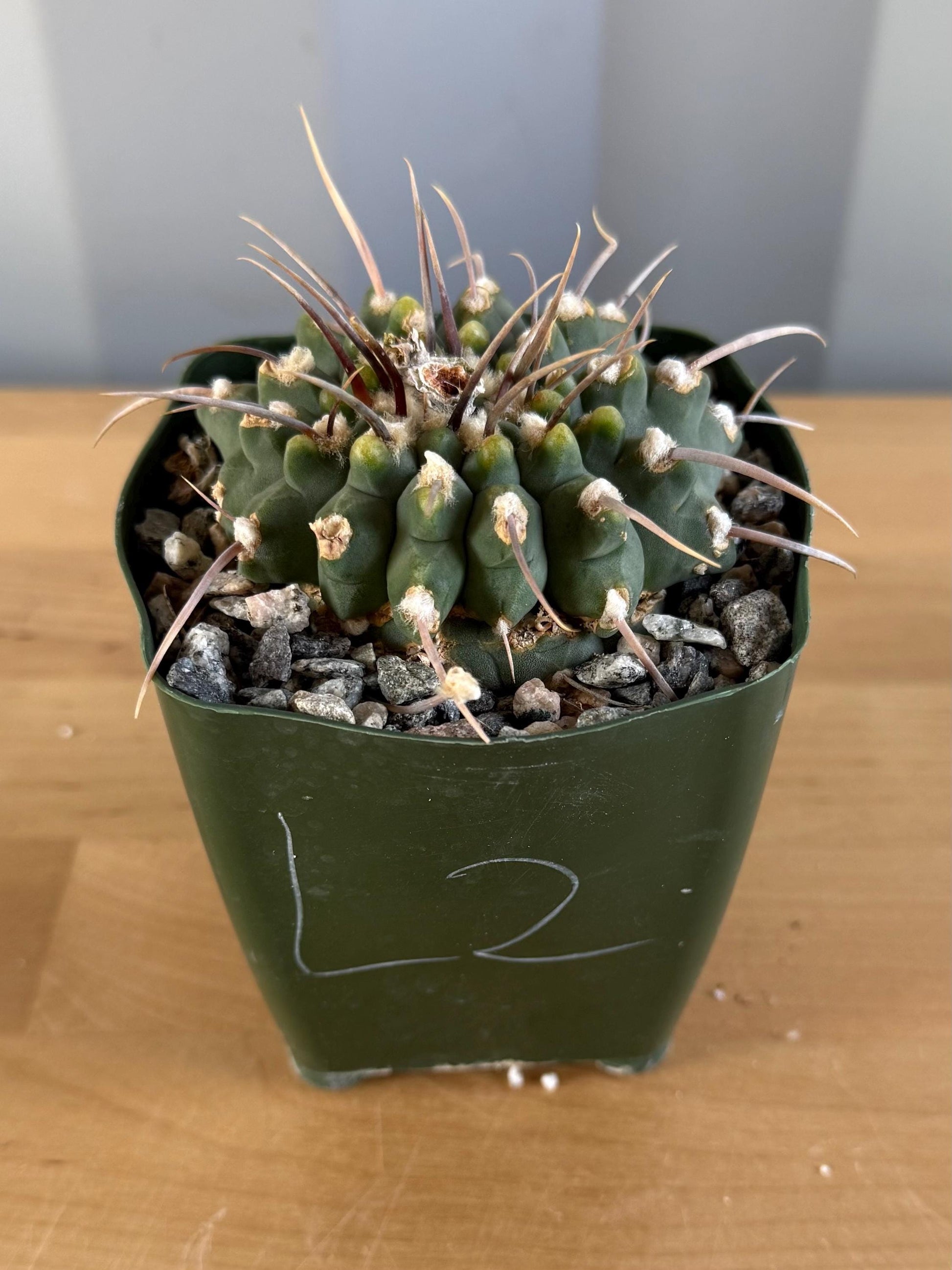 The Gymnocalycium vatteri is a compact, globe-shaped cactus with a matte green to gray-green body and distinct, rounded ribs topped with random and sparse spines. It typically stays small, growing up to 3 inches tall and 4 inches wide, making it ideal for small containers, rock gardens, or indoor displays. This cactus thrives in bright indirect light to partial sun, prefers low water, and should be grown in well-draining soil to prevent root rot. In late spring to summer, it produces beautiful white to pale pink flowers with subtle darker stripes that bloom in contrast to its spiny base. It is low-maintenance and drought-tolerant, making it a great choice for beginners and collectors alike. Allow the soil to dry completely between waterings and reduce watering in winter. Best suited for USDA Hardiness Zones 9–11.