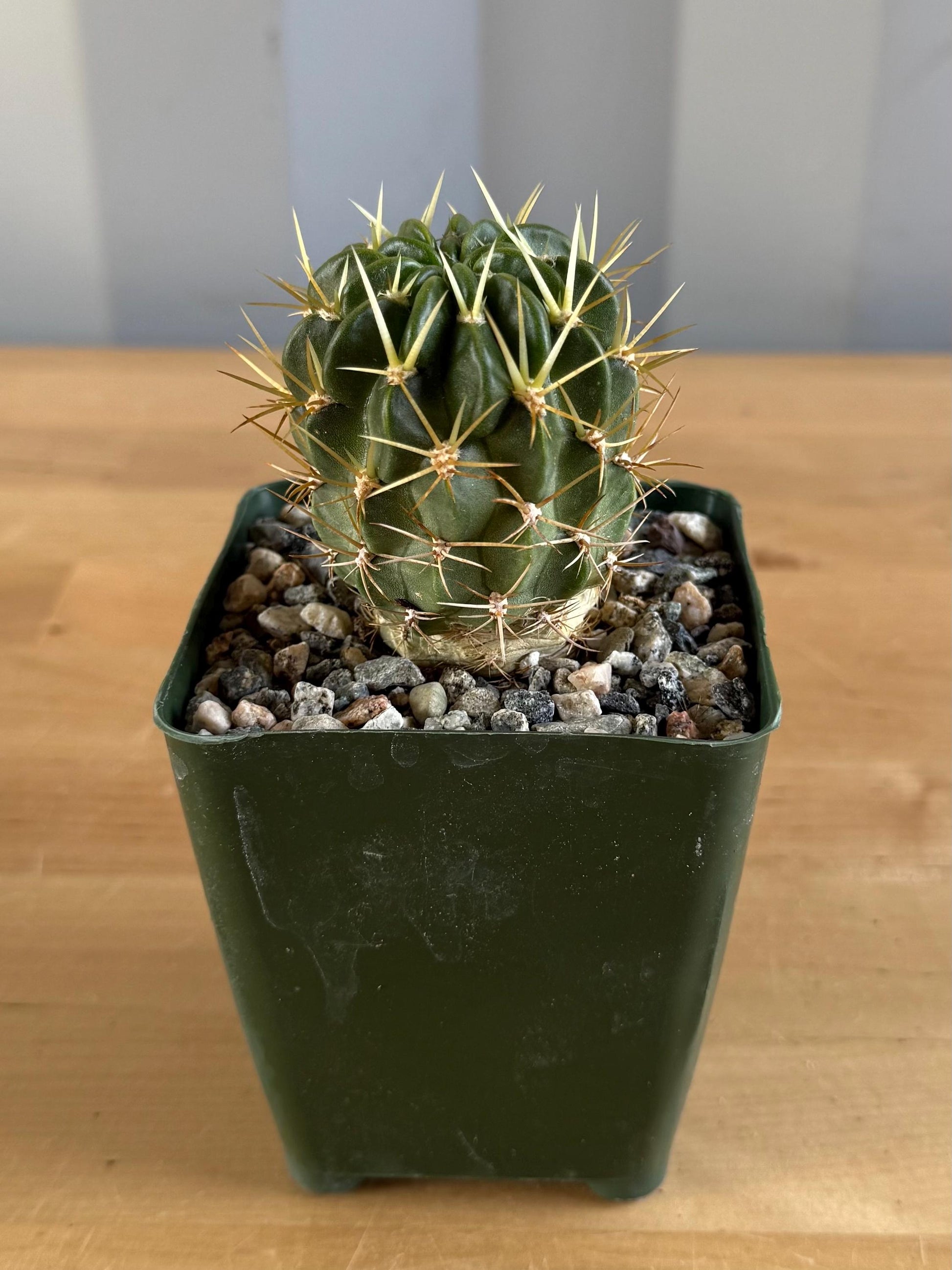 The Lobivia maximiliana v. charazanensis is a striking, clump-forming cactus with a rounded to slightly cylindrical body, featuring deep ribs lined with short dense spines. It remains compact, typically growing up to 6 inches tall and 4 inches wide, and will form attractive clusters over time. This cactus thrives in full sun to partial shade, requires low water, and needs well-draining soil to prevent excess moisture buildup. During late spring through summer, it produces bold red to orange-red flowers with a contrasting yellow center, often appearing in multiples and creating a vivid display. It's well-suited for rock gardens, cactus containers, or sunny windowsills. Water deeply but infrequently during the growing season, and keep dry in winter. Best suited for USDA Hardiness Zones 9–11.