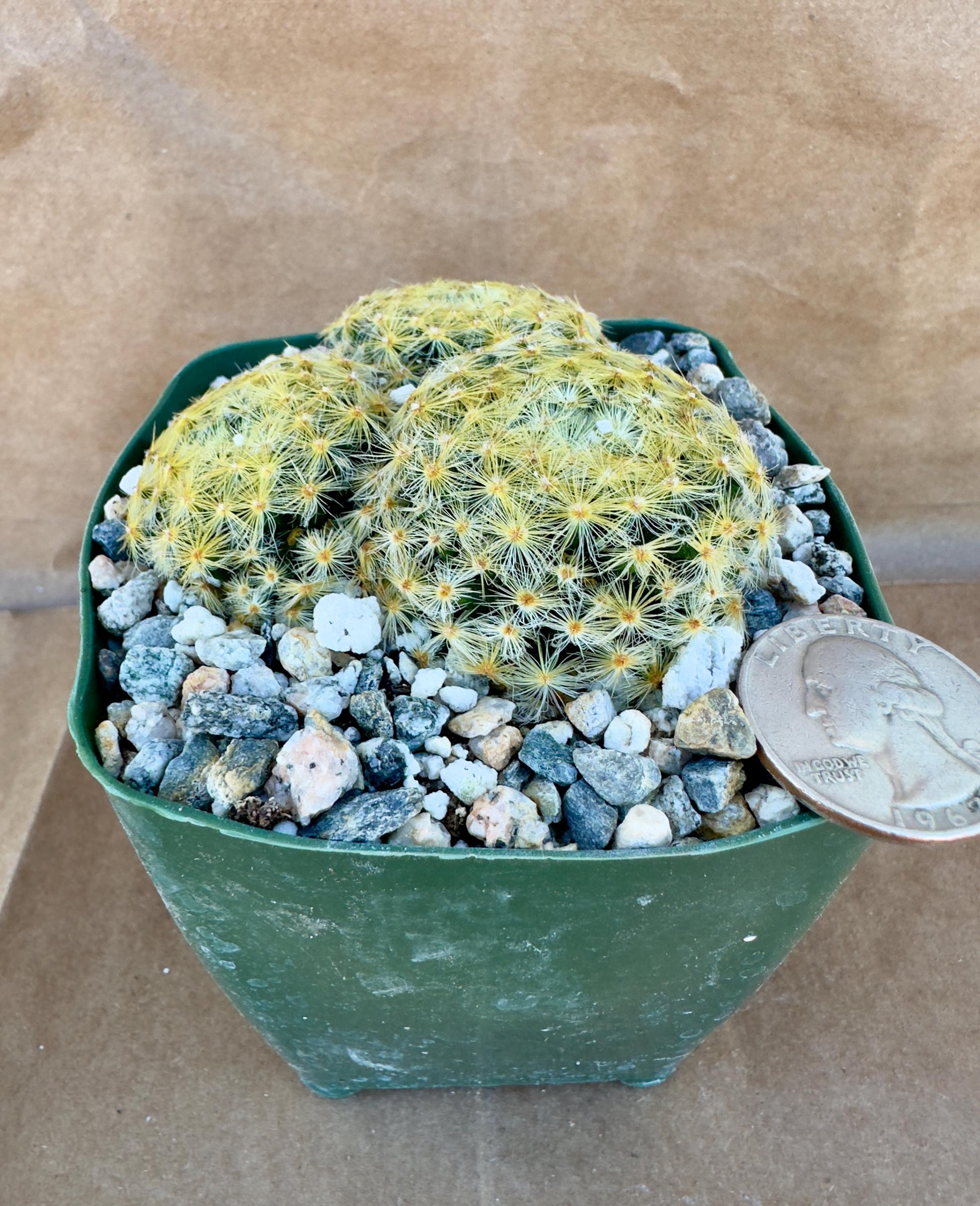 Mammillaria schiedeana, commonly known as the 'Bridal Veil Cactus,' is a charming, globular cactus native to Mexico. This small species typically reaches up to 4 inches (10 cm) in height and 2.5 inches (6 cm) in diameter, making it ideal for compact spaces. Its dark green stems are covered with numerous fine, white to golden spines that create a soft, feathery appearance. In late winter to early spring, it produces small, white to pale yellow flowers that encircle the top of the plant, adding to its ornamental appeal. This cactus thrives in bright, indirect sunlight and prefers well-draining soil with a high mineral content. It is drought-tolerant and requires minimal watering; allow the soil to dry out completely between waterings to prevent root rot. While it can withstand brief periods of light frost if kept dry, it is best to protect it from freezing temperatures.