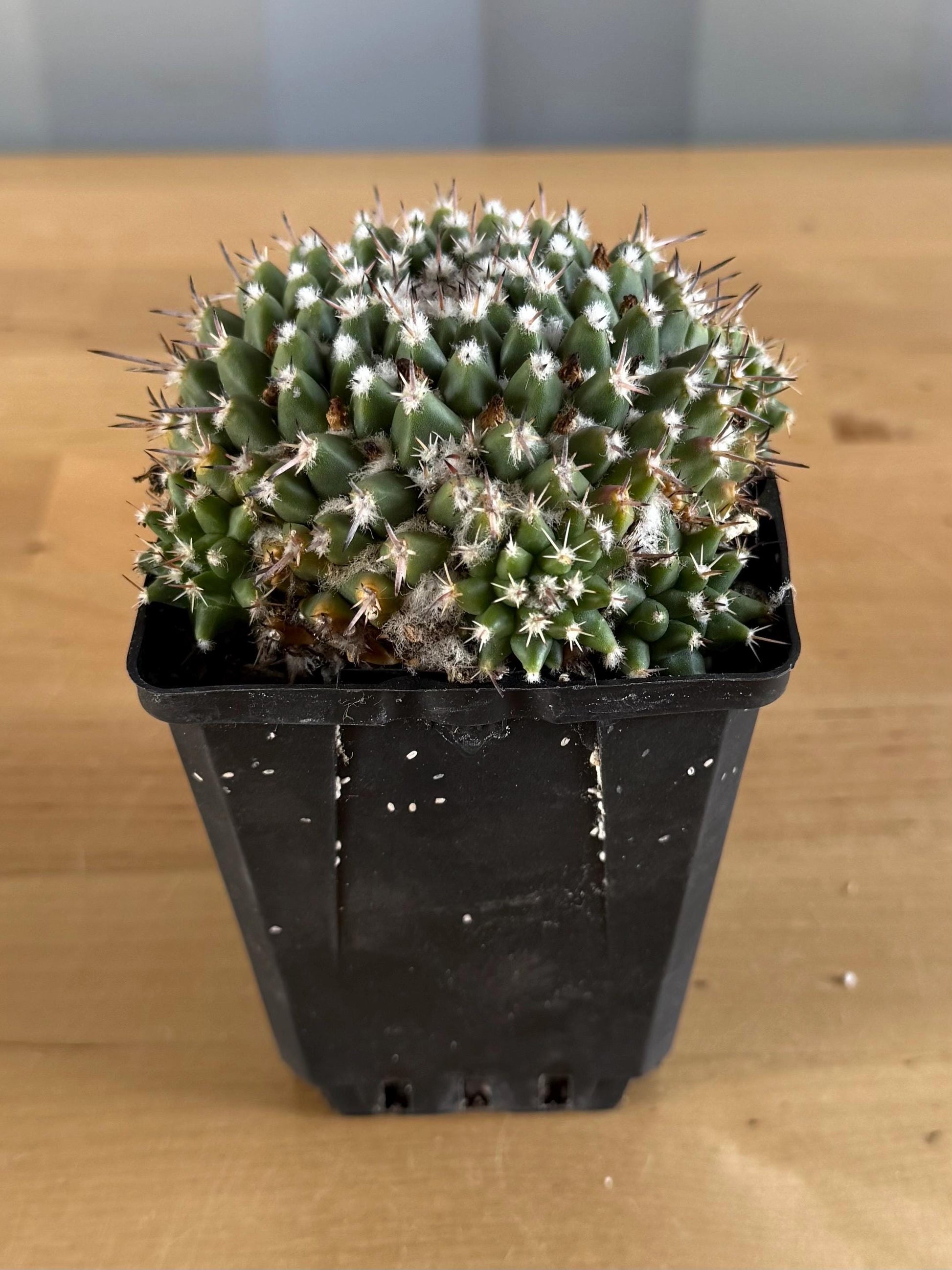 The Mammillaria scrippsiana is a charming, clump-forming cactus with small, rounded stems covered in dense white radial spines. Each stem typically can grow up to 4 inches tall and 2 inches wide, gradually forming attractive mounds over time. It thrives in full sun to bright indirect light, requires low water, and does best in well-draining, gritty soil to prevent rot. In spring, it produces delicate pale pink to lavender flowers that bloom in a ring around the top of each stem, creating a classic Mammillaria "flower crown" effect. This cactus is drought-tolerant and should be watered sparingly, especially during its winter dormancy. Perfect for rock gardens, small containers, or windowsill collections. Best suited for USDA Hardiness Zones 9–11.