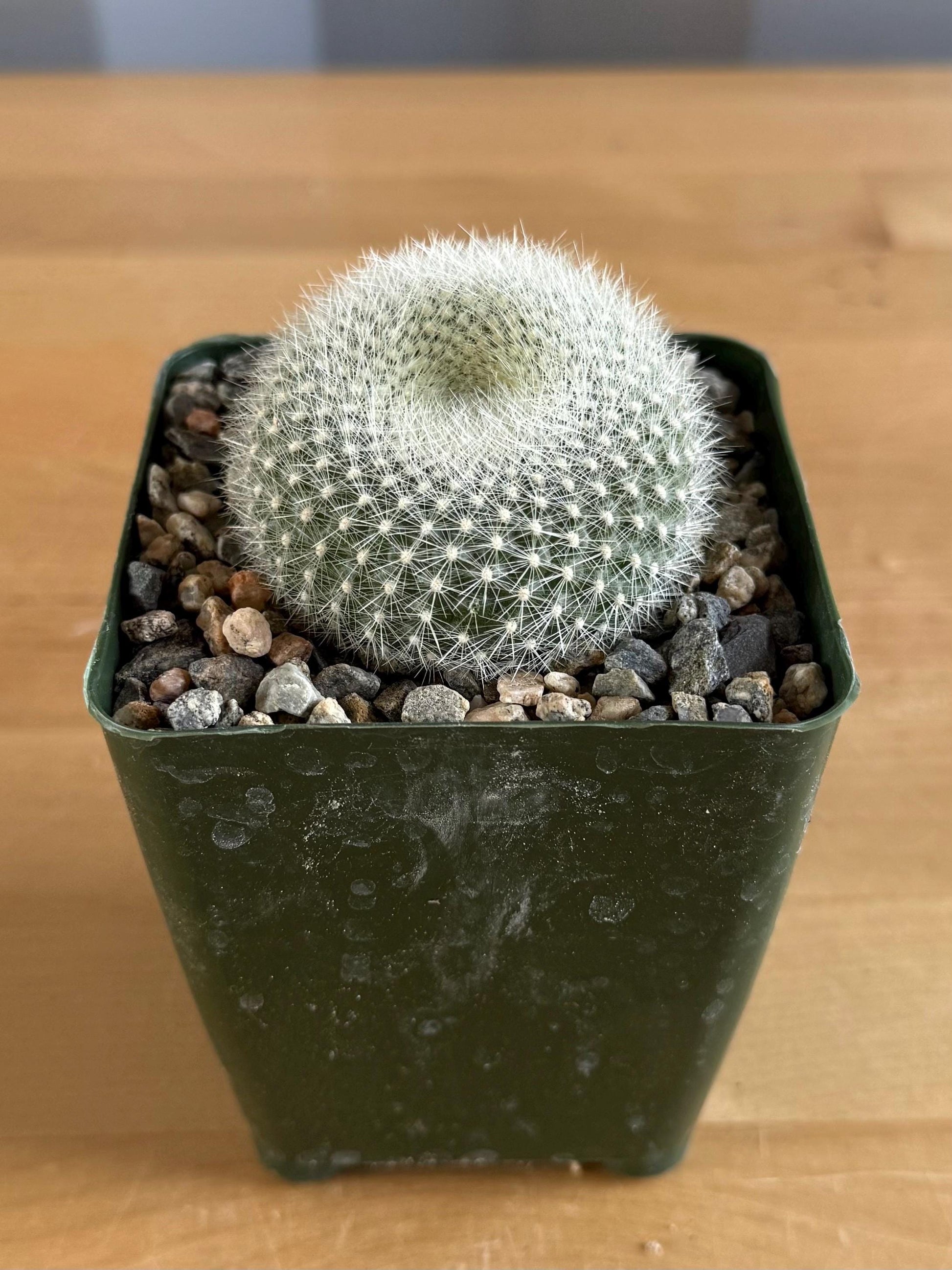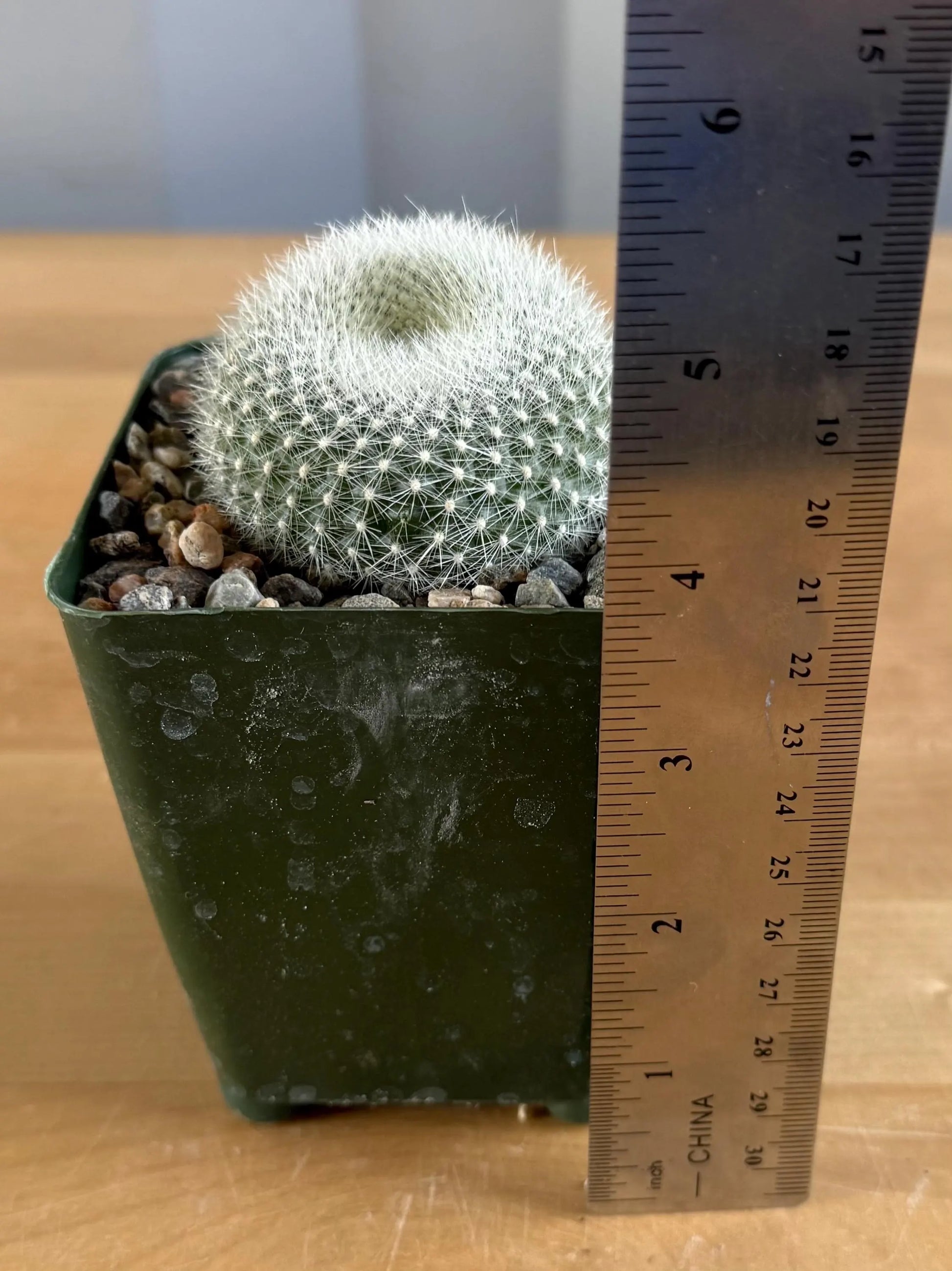 The Parodia haselbergii, also known as the Scarlet Ball Cactus, is a small, spherical cactus covered in dense white radial spines that give it a soft, fuzzy appearance. It typically stays compact, growing up to 4 inches tall and 4 inches wide, making it perfect for small pots, sunny windowsills, or decorative arrangements. This cactus thrives in bright indirect light to full sun, needs minimal watering, and prefers well-draining soil to prevent overwatering. In late spring through summer, it produces vivid scarlet-red flowers that create a striking contrast against its pale spines, often blooming in a ring near the crown. It’s well-suited for indoor or outdoor dry conditions and benefits from being kept dry during winter dormancy. Easy to care for and visually striking, it’s a great choice for cactus collectors and beginners alike. Best suited for USDA Hardiness Zones 9–11.