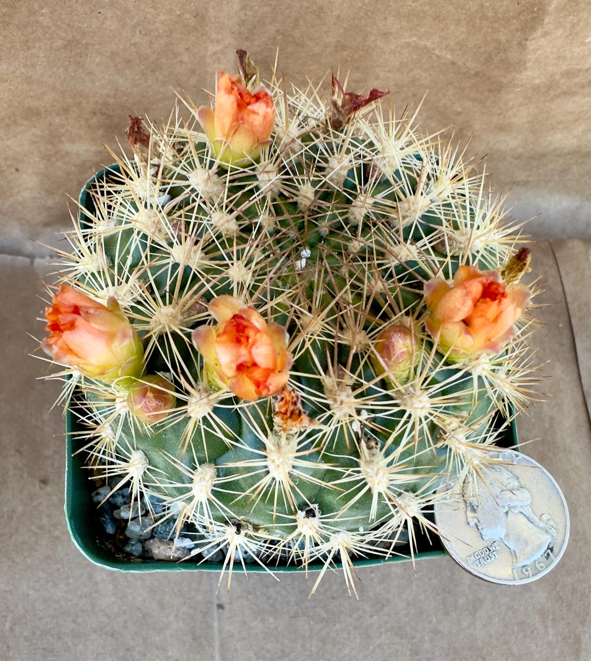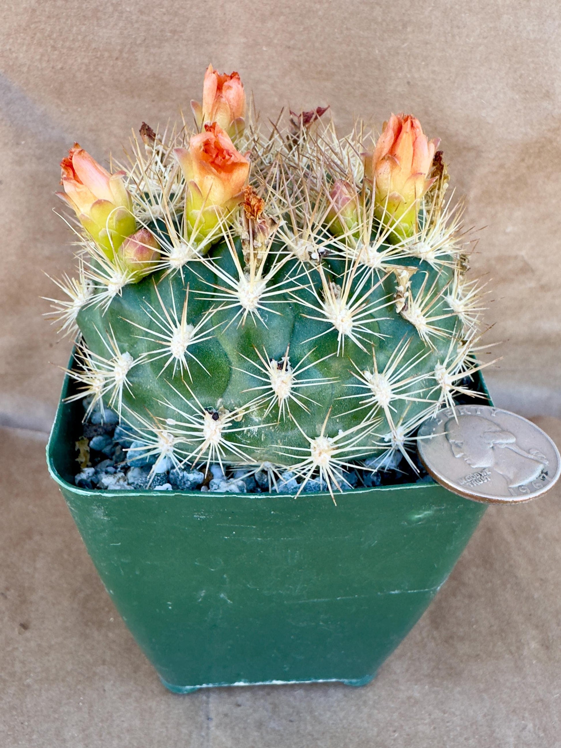 Weingartia trollii, also known as Rebutia trollii, is a captivating cactus species native to Bolivia, admired for its distinctive appearance and vibrant blooms. This solitary, globose to short cylindrical cactus features 16 to 18 tuberculate ribs, often spiraling, adorned with 2 to 8 central spines up to 2 cm long and 16 to 24 yellowish radial spines with brown tips, each about 1 cm in length. Mature plants can reach up to 8 inches (20 cm) in height and 10 cm (4 inches) in diameter. In early summer, it produces striking orange to orange-scarlet flowers approximately 2.5 cm in diameter, which uniquely emerge near the apex of the plant and remain open for five to six days. This cactus thrives in full sun and requires well-draining soil to prevent root rot. It is drought-tolerant and benefits from regular watering during the summer months, allowing the soil to dry out completely between waterings. Weingartia trollii is suitable for USDA hardiness zone 10 and can tolerate temperatures down to 24.8°F (-4°C), though it should be protected from prolonged frost. This low-maintenance cactus is ideal for both novice and experienced collectors seeking a unique addition to their plant collection.