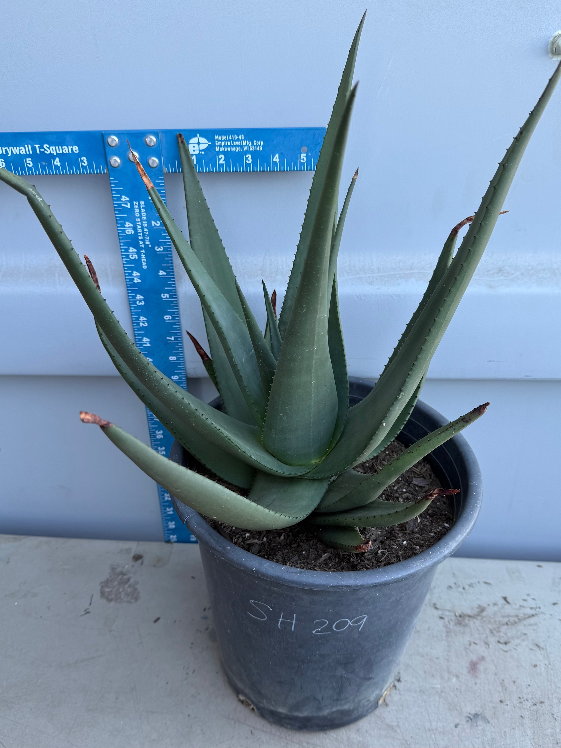 Succulent plant with solitary stemless rosettes densely packed with upright, curved smooth grey-green leaves with small sharp reddish-brown spines along the margins. The beautiful bi-colored red and yellow flowers appear well above the leaves in branched racemes in late winter with red buds opening to yellow flowers from the bottom of the inflorescence up. Plant in full sun to light shade in a well-drained soil and water occasionally to regularly in summer (from a summer rainfall area). Hardy to 20°F.