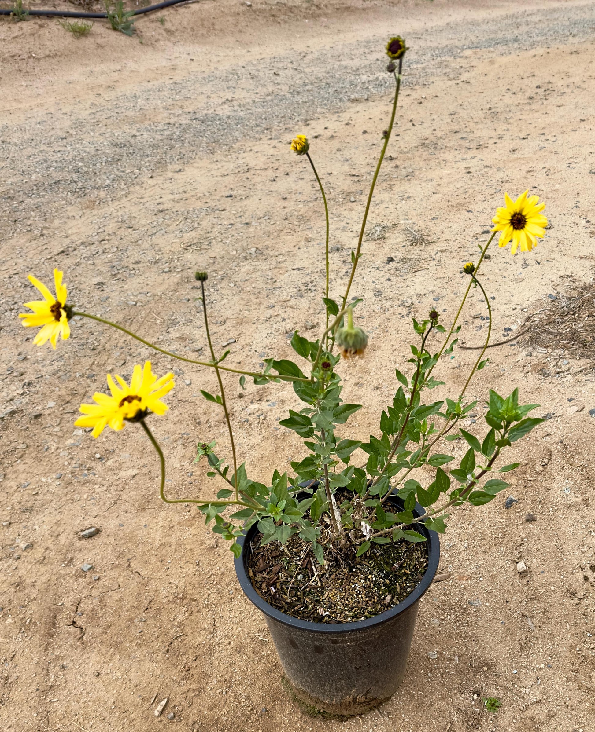 California Brittlebush (Encelia californica), also known as Bush Sunflower, is a fast-growing, semi-deciduous shrub native to Southern California and Baja California. It features bright yellow, daisy-like flowers with dark centers that bloom from late winter through spring, attracting bees, butterflies, and birds. The plant typically grows 3 to 5 feet tall and 4 to 7 feet wide, forming a rounded, mounding habit with green, diamond-shaped leaves. Thriving in full sun and well-drained soils, it is highly drought-tolerant once established, making it ideal for low-water landscapes and erosion control. Hardy in USDA Zones 9–10, California Brittlebush adds vibrant color and supports pollinators in native plant gardens. Its low maintenance and adaptability make it a valuable addition to sustainable and wildlife-friendly landscapes.