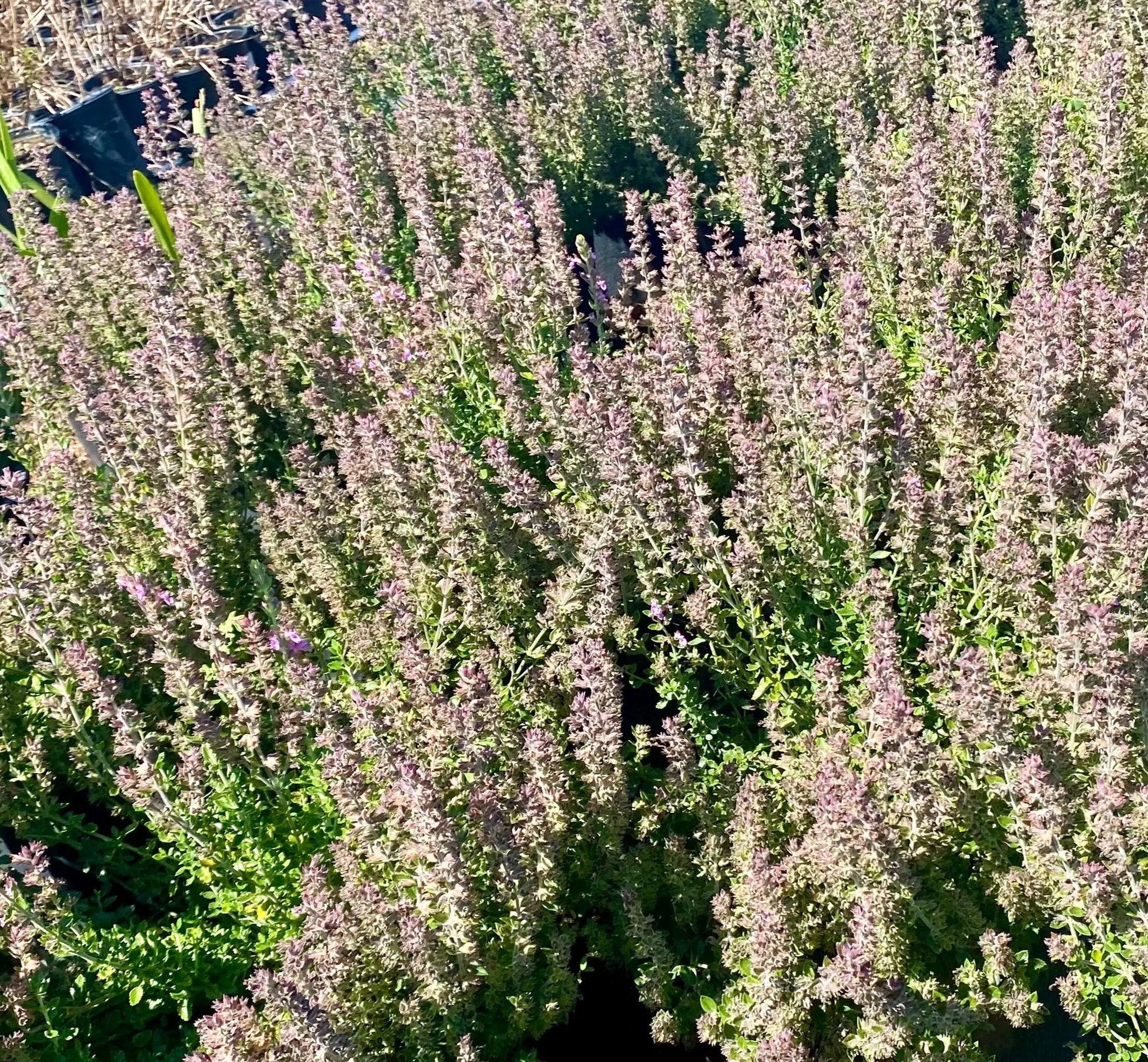 Teucrium chamaedrys (Wall Germander) - This low-growing evergreen dark green subshrub grows 2 feet tall and spreads 2-3 feet by underground rhizomes. It has small leaves that have deeply serrated edges and in late spring into summer, spikes of magenta-pink colored flowers rise above the foliage. Plant in full sun and water occasionally. Thrives in heat and most any soil and is hardy to 0 degrees F. Lightly shear in late winter to keep dense and neat. A great clean looking plant for a low hedge or edging plant and attractive to bees and butterflies.