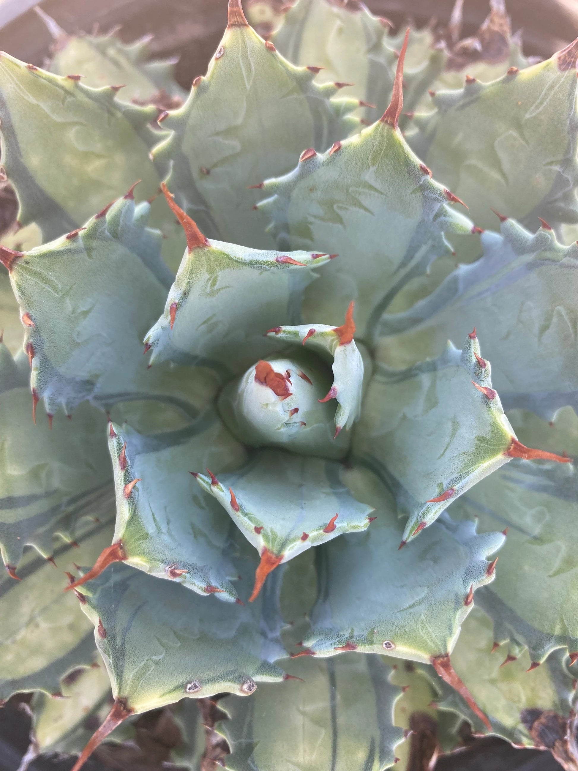 Agave 'Becky' is a selection of the Mexican Agave potatorum that forms an architectural small, slow-growing clump of 1' tall x 18" wide. The short leaves are edged in glaucous green with a lovely creamy chartreuse center that brightens in the sun. The terminal spines emerge orange, then change to cinnamon, before aging brown...a truly delightful container specimen where it isn't winter hardy. Hardy USDA Zones 9b-11b.