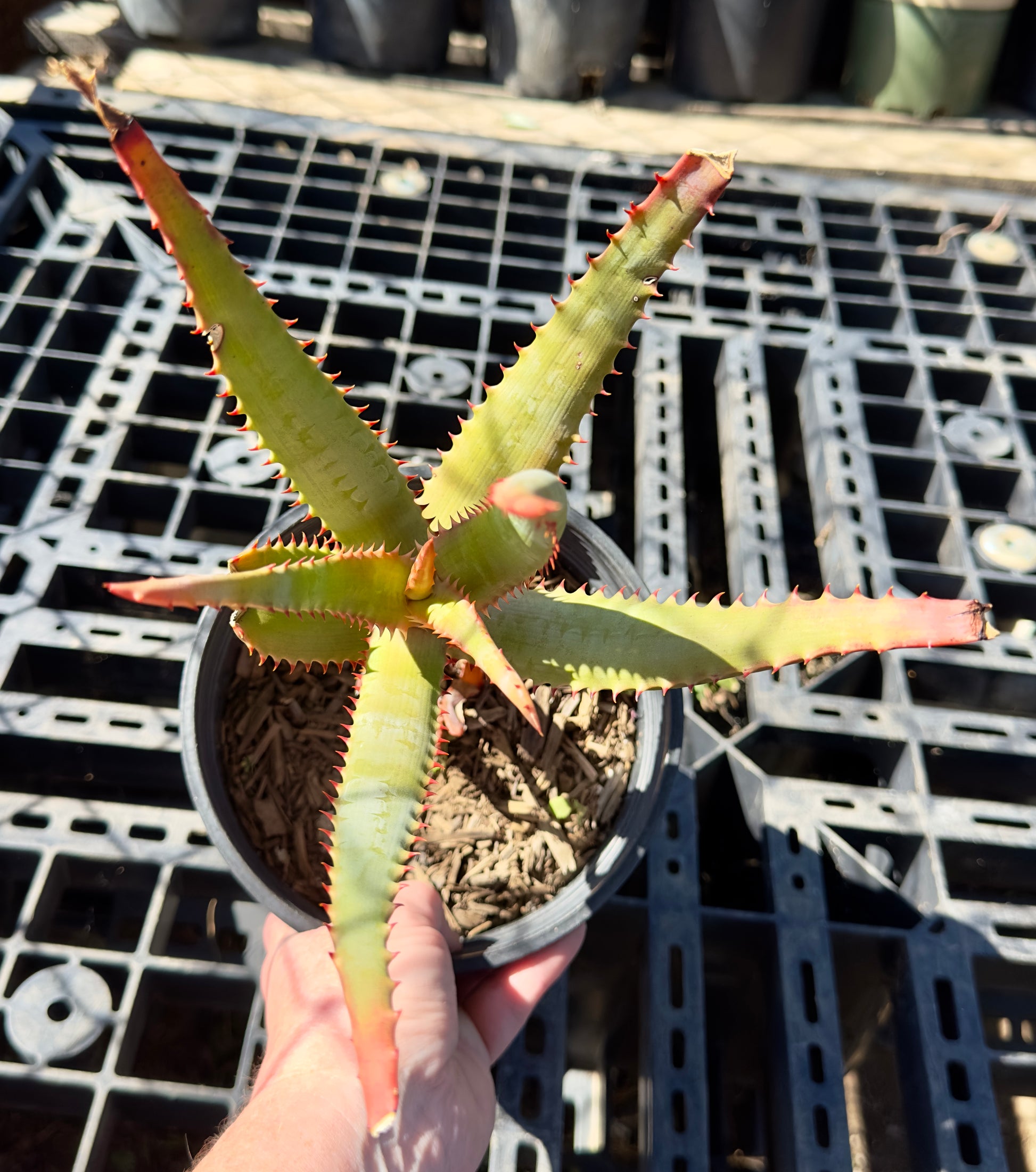 Aloe cameronii hybrid is a striking medium-sized succulent prized for its dense rosettes of smooth, reddish-green leaves that deepen to fiery copper or crimson under bright sun or seasonal stress. Forming clumps that reach approximately 1–2 ft tall and 2–4 ft wide, it becomes an architectural focal point whether in containers or garden beds. During winter into early spring, it sends up tall (up to 3 ft) spikes bearing vibrant orange-red tubular flowers, attracting hummingbirds and pollinators. This hybrid thrives in full sun to partial shade, in sandy, well-draining soil, and responds well to a soak-and-dry watering routine—watering lightly in growing season and withholding moisture in cooler months to enhance leaf color. Hardy to the mid‑20 °F (Zone 9b), it is drought‑tolerant once established and low‑maintenance with minimal fertilizer needed. Ideal for xeriscapes, rock gardens, or sunny patios, this hybrid adds year-round structure, seasonal blooms, and dramatic foliage coloration to any succulent collection.