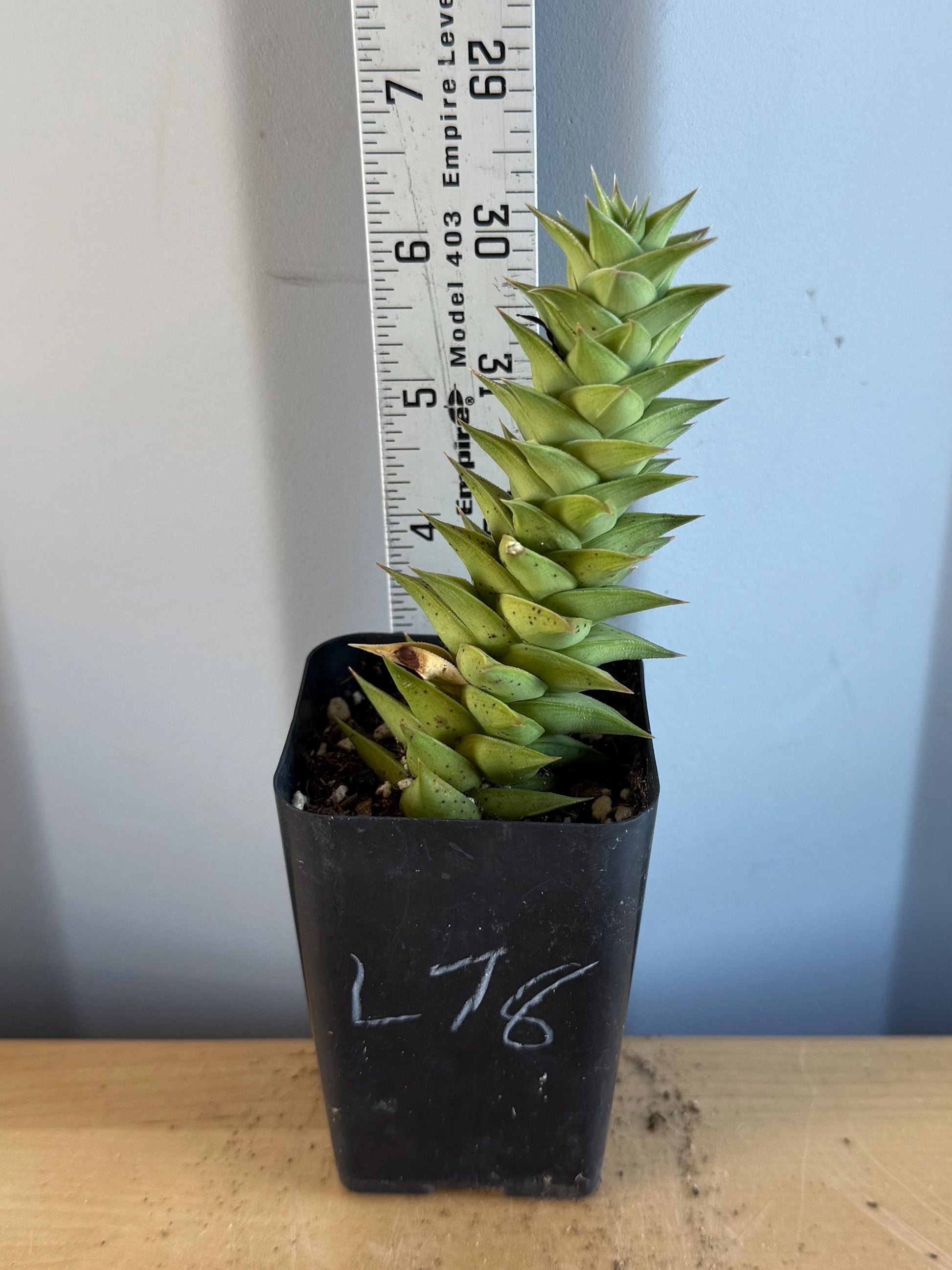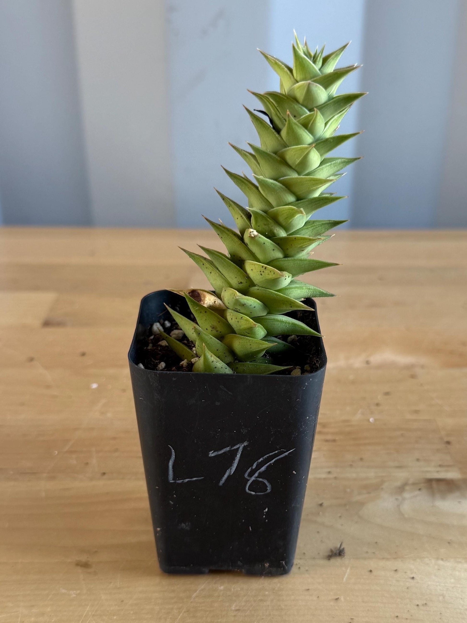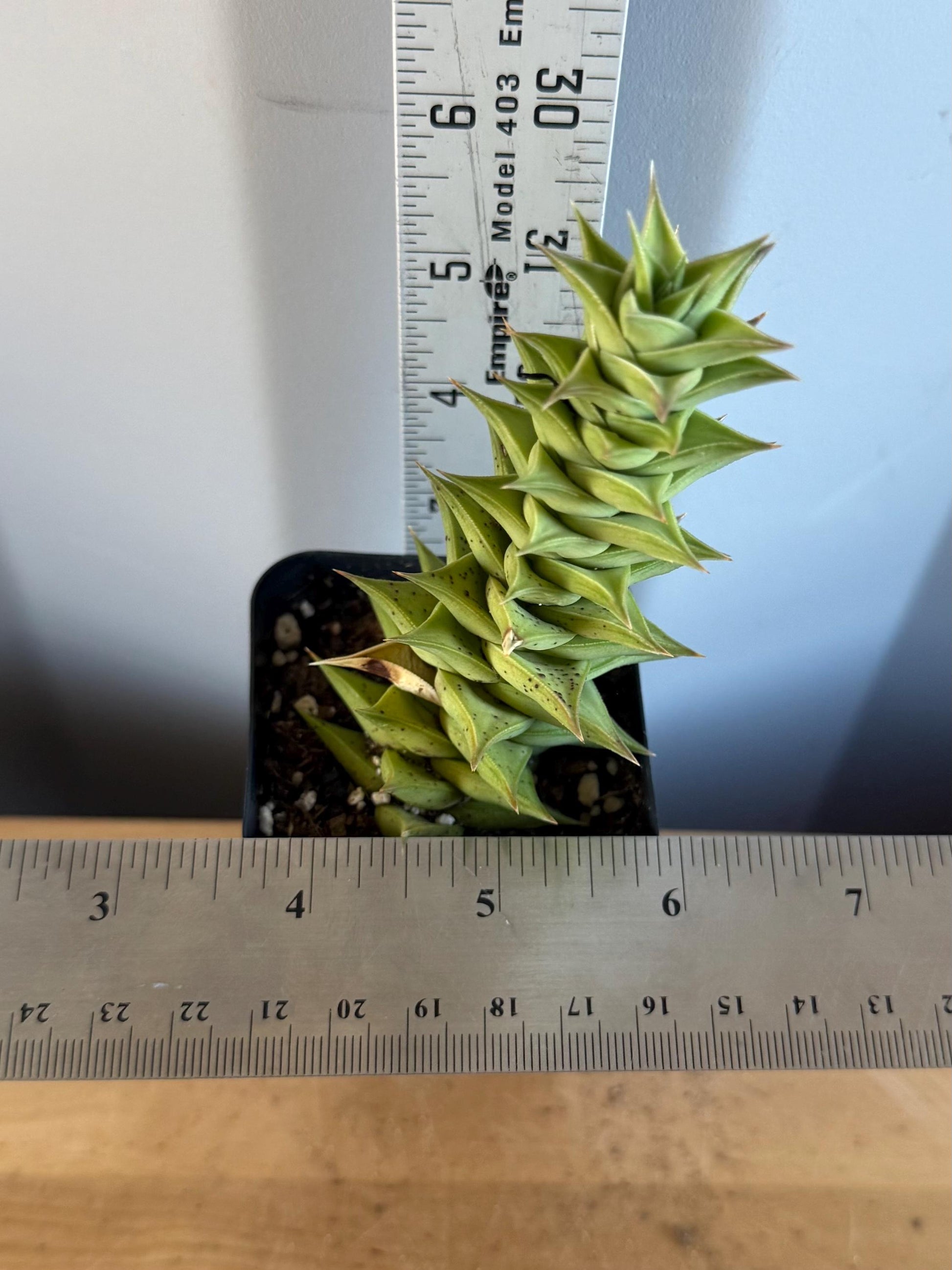 The Astroloba spiralis is a rare and eye-catching succulent known for its spiraling columns of firm, dark green triangular leaves that grow in a tight, geometric pattern along upright stems. This slow-growing plant can reach up to 12 inches tall and 4 inches wide, making it ideal for small pots, modern planters, or succulent arrangements. It thrives in bright indirect light to partial sun, requires very little water, and must be planted in well-draining soil to prevent root rot. During late summer to early fall, it may produce small, tubular white to pale green flowers on tall, slender stalks, though it's primarily grown for its stunning foliage. Drought-tolerant and easy to maintain, this succulent is perfect for collectors and low-maintenance plant lovers alike. Be sure to let the soil dry out completely between waterings and protect from frost. Best suited for USDA Hardiness Zones 9–11.
