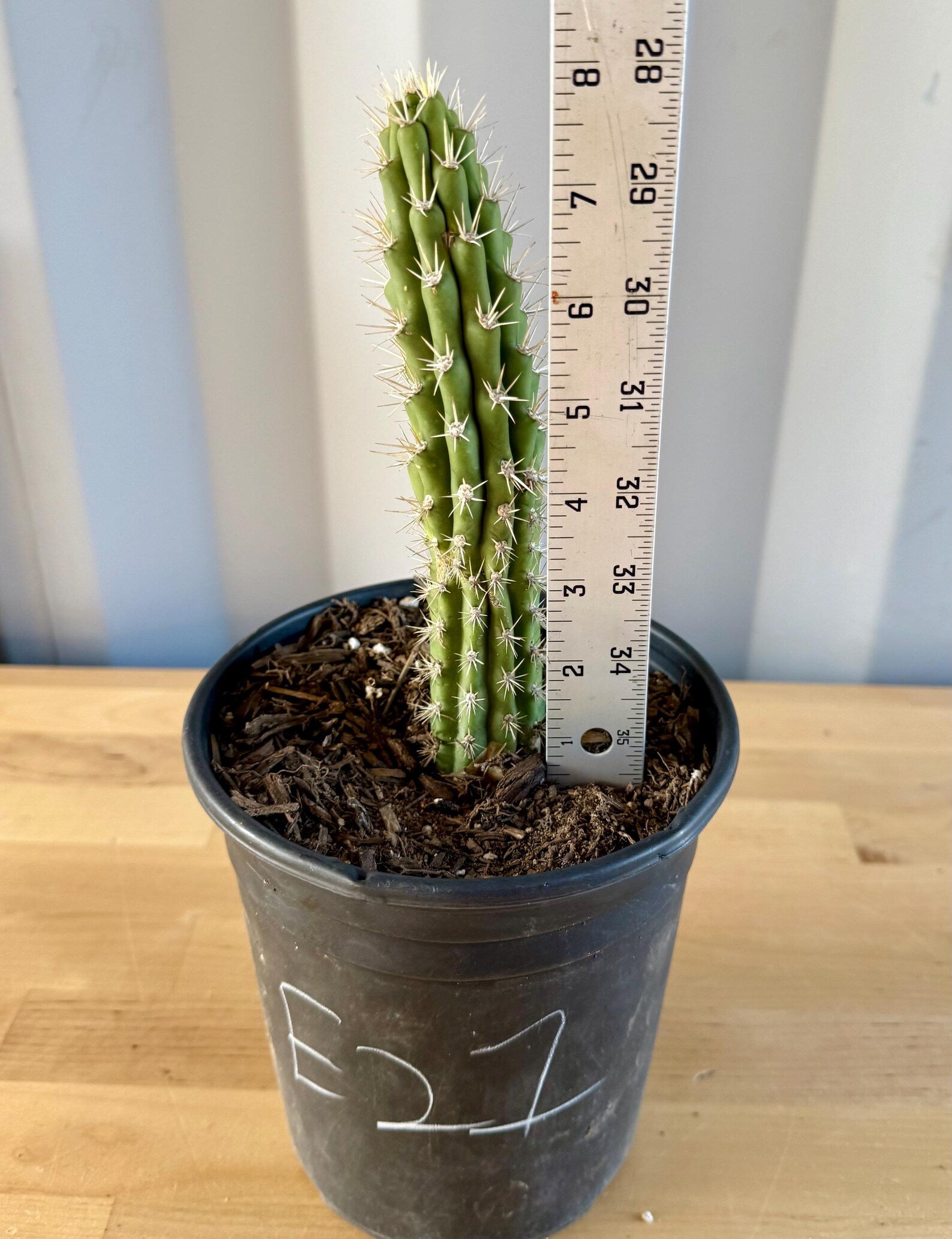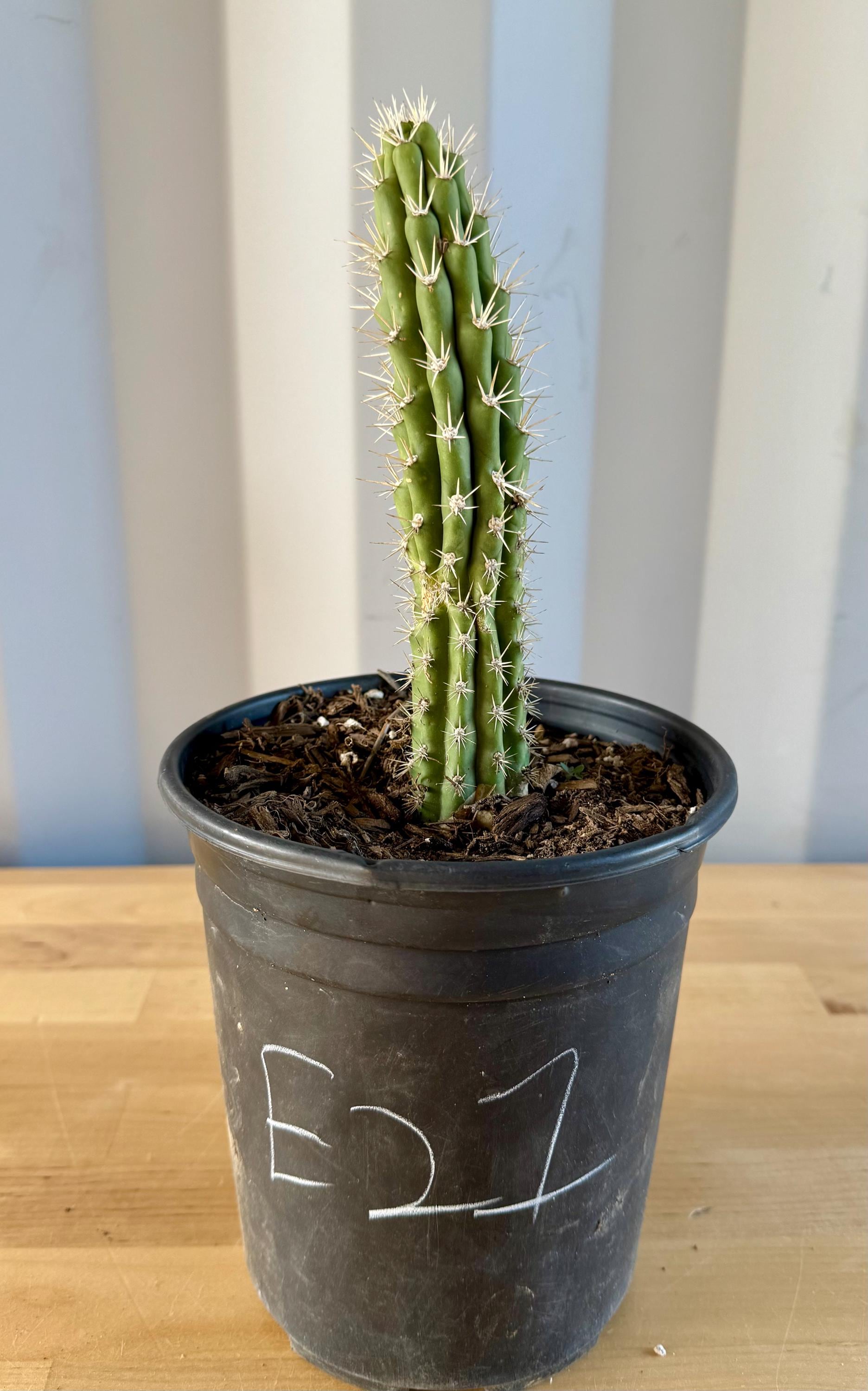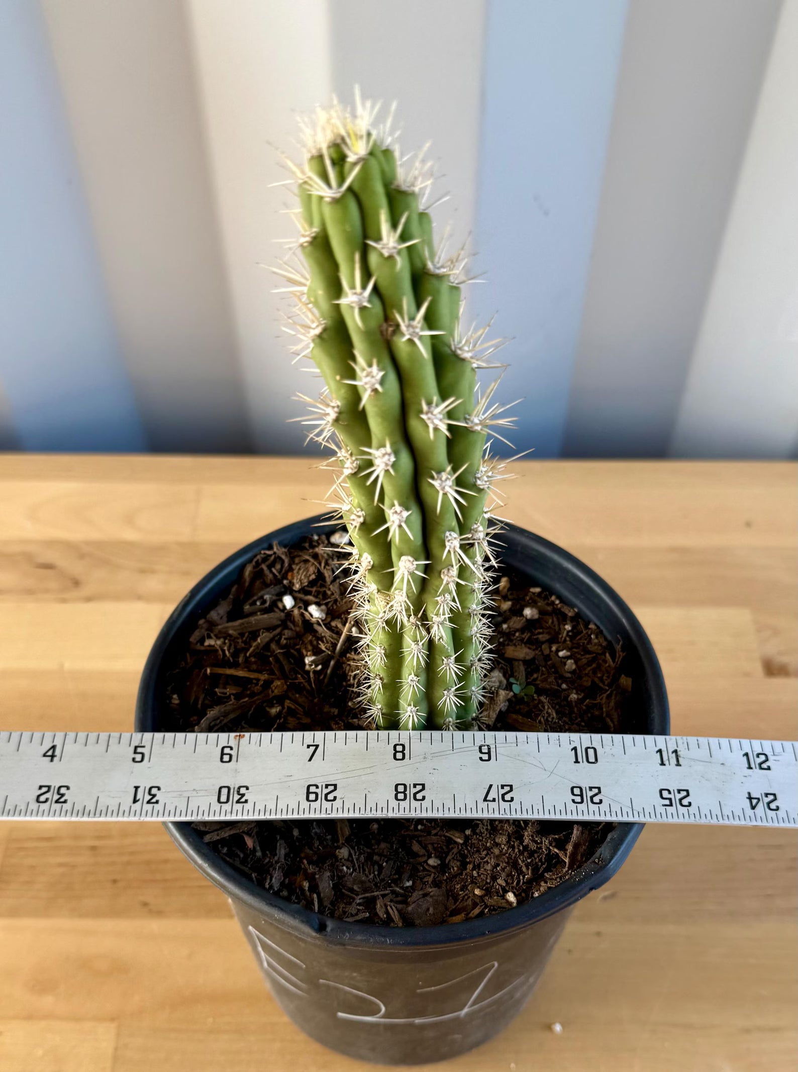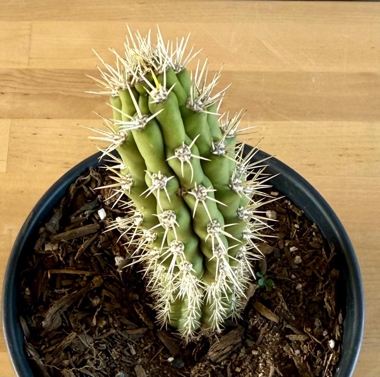 Browningia caineana (syn. Castellanosia caineana) is a striking tree‑forming cactus with grey‑green, segmented columnar stems bearing pronounced ribs and showy dimorphic spines—strong spines lower down and fine bristles near flowering tips. This architectural species can grow up to 5–6 m tall, branching at the base to form a dramatic desert silhouette. In warm seasons, it produces deep red, funnel‑shaped flowers at the top of stems, creating a vibrant contrast . Native to dry shrublands in Bolivia and Paraguay, it thrives in full sun, sandy, well‑draining soil, and requires infrequent, deep watering during active growth . Keep dry through cooler months (5–15 °C) to prevent rot. Perfect for xeriscape gardens, large containers, or collectors seeking bold, drought‑tolerant statement plants.