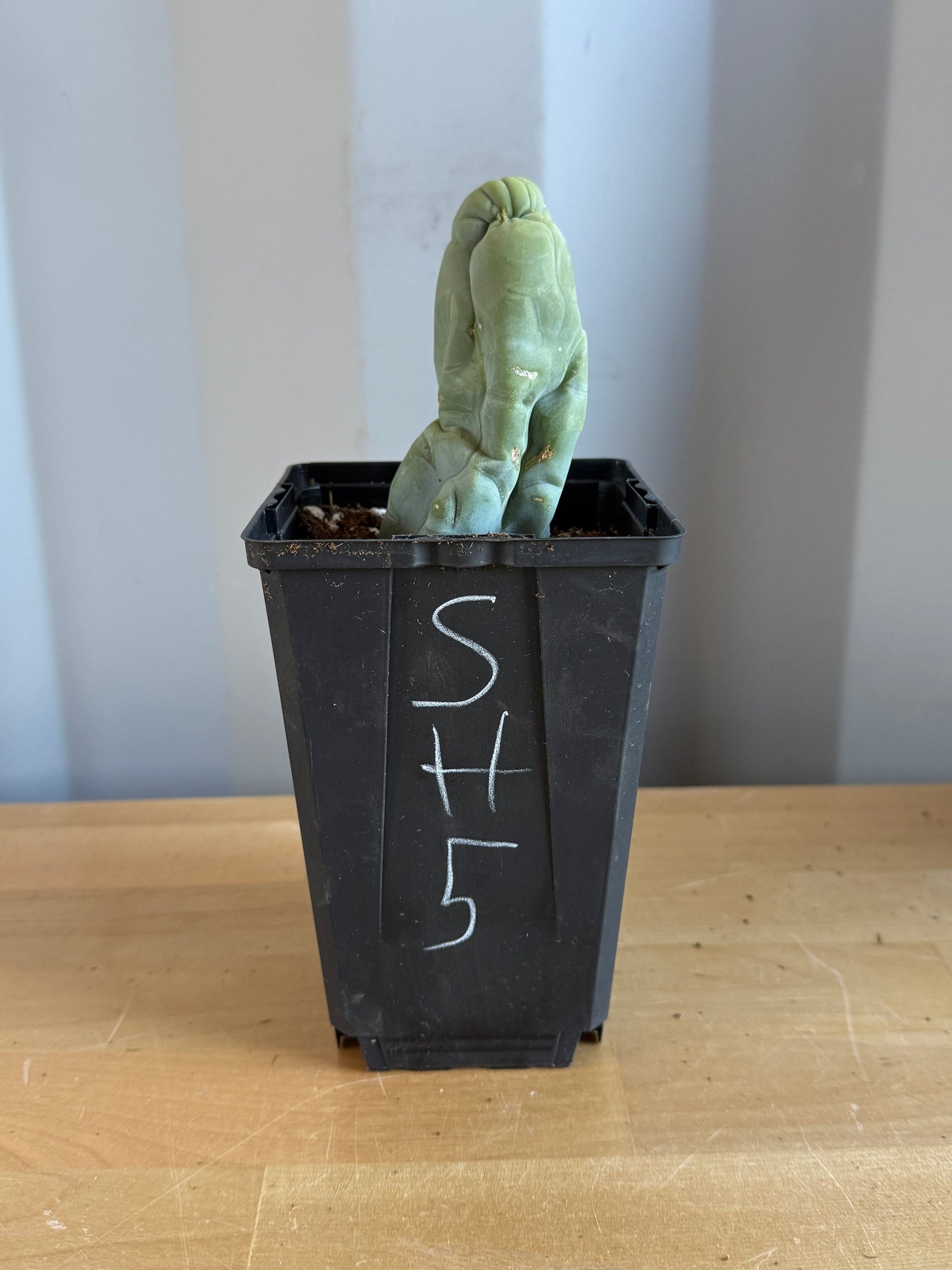 Bruce’s Dragon is a striking cactus cultivar with knobbly, sculptural bluish-green stems and sparse honey-to-brown spines, showcasing the curious monstrose form of the trunk of this columnar species. It is able to develop into a tall, branching specimen—many related plants reach roughly 2-5 m (6-16 ft) in height under ideal conditions. Best grown in bright light or full sun with minimal regular water and a very well-draining cactus mix, it prefers warm, dry conditions and should be kept relatively dry in winter to avoid rot. This specimen thrives in USDA zones roughly 9–11 or indoors where sun is strong, and responds to occasional deep watering followed by thorough drying. It’s a bold accent plant for desert-style or succulent collections and rewards the patient grower with dramatic form.”