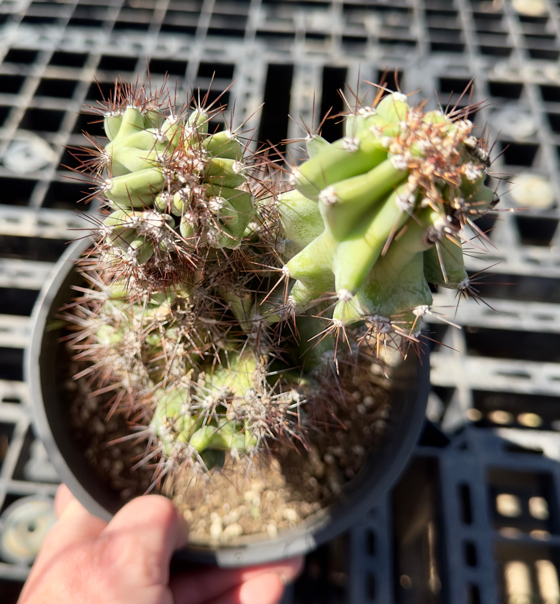 Cereus peruvianus monstrose, also known as the Monstrose Apple Cactus, is a sculptural treat with its twisted, contorted blue-green columns and prominent ridges—an eye-catching addition to any succulent collection. Over many years, this slow- to moderate-growing cactus can reach heights of 15–30 feet outdoors, though it remains more compact in containers. It thrives in full sun to partial shade and prefers well-draining sandy or cactus soil, with a “soak-and-dry” watering approach during its spring–summer growing season; reduce watering significantly in fall–winter to prevent root rot. Hardy in USDA Zones 9b–11, this hardy xerophyte tolerates brief dips to ~20°F (−6 °C) when kept dry . In late spring to summer, it may reward you with large, fragrant, night-blooming white flowers (6–8″ across), followed by edible “Peruvian apple” fruits. Low-maintenance and architectural, this rare monstrose form is perfect for drought-tolerant gardens, dramatic containers, or as a sculptural indoor specimen near a bright window.