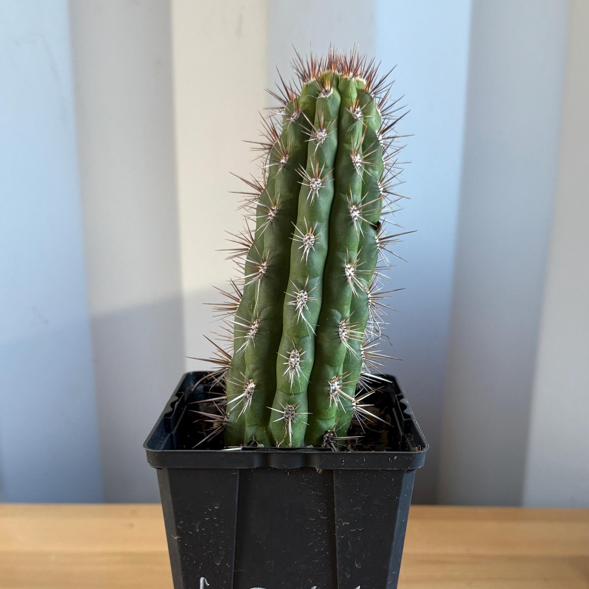 Cleistocactus fieldianus is a unique, columnar cactus known for its tall, slender green stems that are densely covered in short white spines. This fast-growing species can reach up to 3 feet tall and about 2 inches wide, often branching from the base to form clumps over time. It prefers full sun to partial shade and thrives in dry, well-draining soil with minimal watering, making it perfect for xeriscapes and container gardens. In the summer months, it produces stunning tubular red to reddish-orange flowers that protrude horizontally from the stems, attracting hummingbirds and other pollinators. Cleistocactus fieldianus is drought-tolerant and performs best when protected from frost and excess moisture. Suitable for USDA Hardiness Zones 9–11.