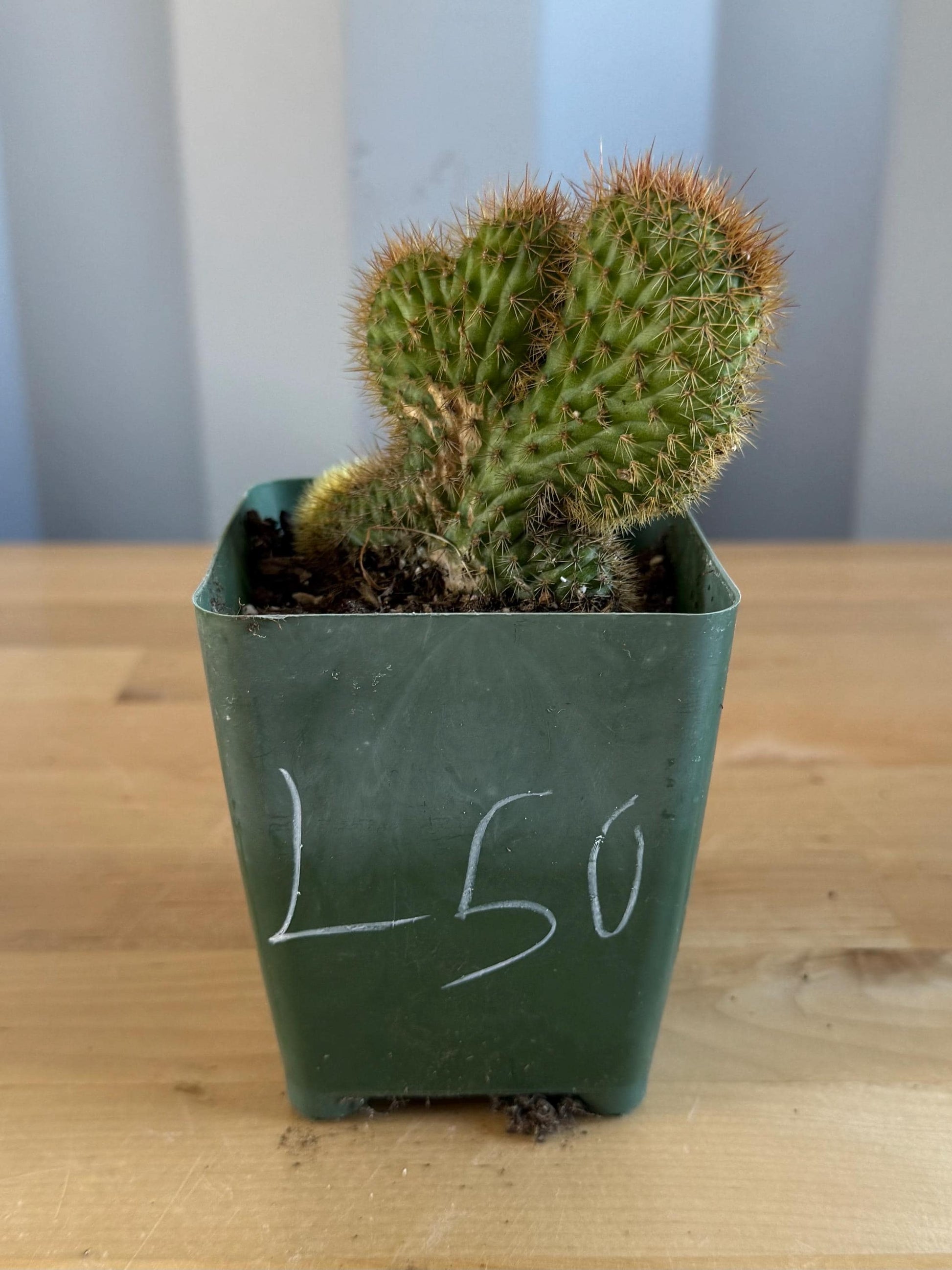 The Cleistocactus winteri cristata, also known as the Crested Golden Rat Tail Cactus, is a striking and unusual succulent prized for its twisting, fan-shaped stems covered in soft golden spines. Its unique crested growth pattern makes each plant one-of-a-kind, with sculptural, wave-like forms that look incredible in pots or hanging baskets. This cactus can spread up to 12 inches wide and reach about 6 to 8 inches tall, although growth can vary depending on how it’s shaped over time. It thrives in full sun to partial shade and prefers low water, making it a great low-maintenance option for warm, dry climates or indoor windowsills with bright light. In late spring to early summer, it may produce vibrant orange-pink flowers, though blooms are less common on crested forms. It requires well-draining soil and protection from frost or excess moisture. Best suited for USDA Hardiness Zones 9–11.