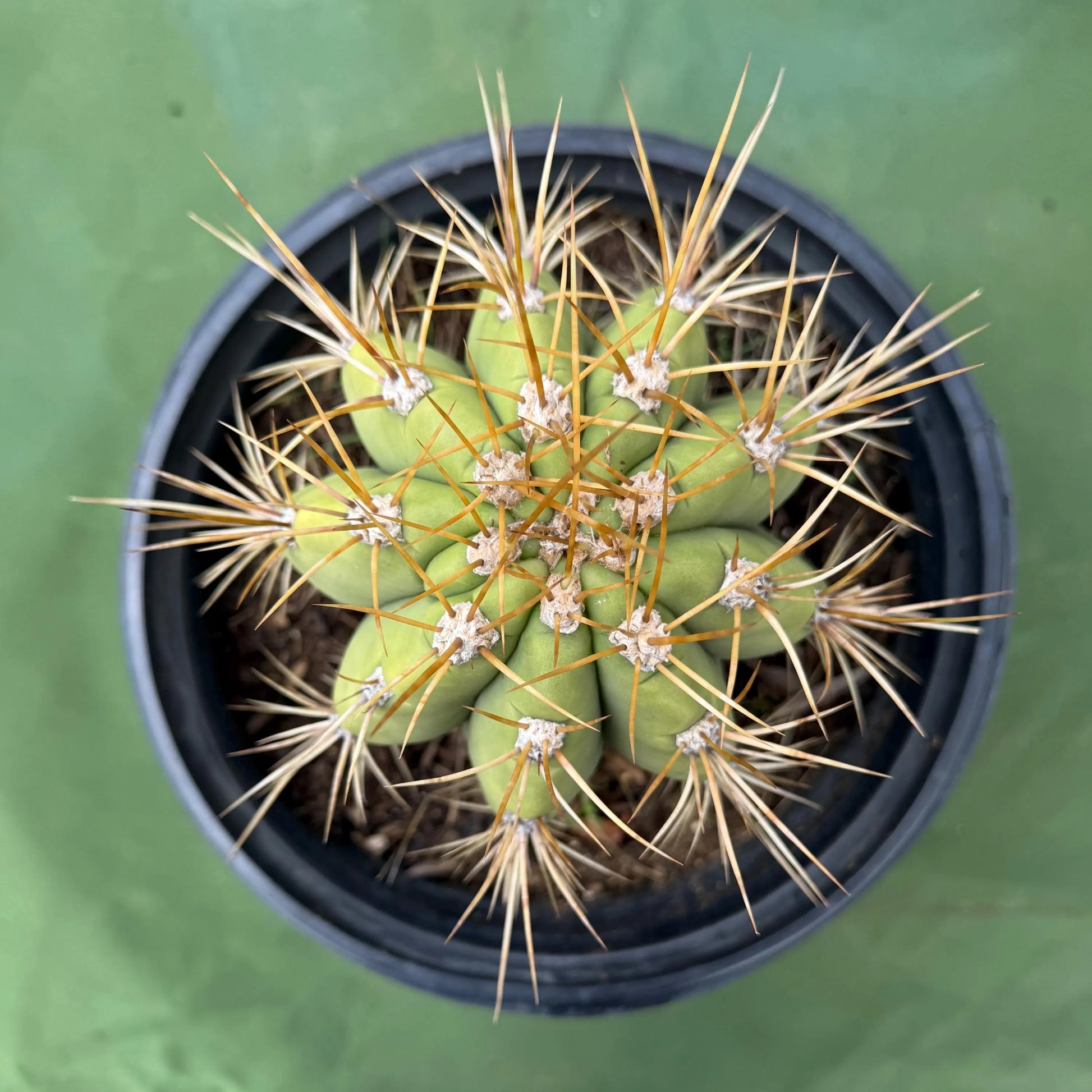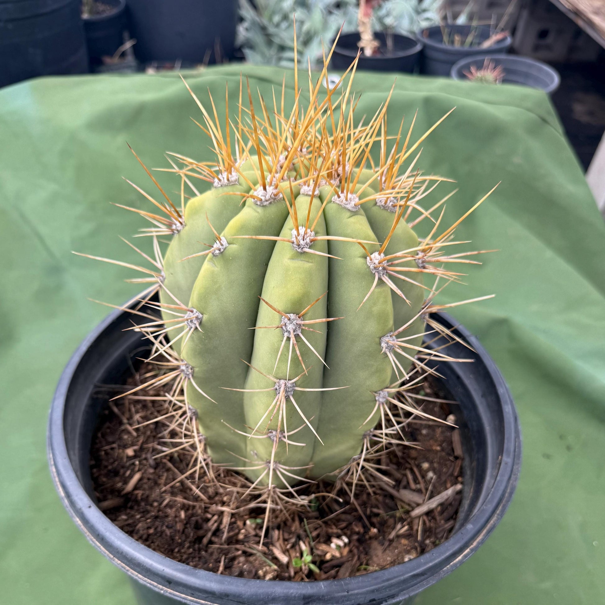 Echinopsis terscheckii is a striking columnar cactus native to the arid regions of Argentina and Bolivia. It features light green stems with prominent ribs and clusters of yellow spines that can grow up to 4 inches long. In its natural habitat, this cactus can reach impressive heights of 32 to 49 feet with a diameter of up to 24 inches, though cultivated specimens are generally more modest in size. It produces large, white, funnel-shaped flowers that bloom in the evening during late spring and summer. Echinopsis terscheckii thrives in full sun and is highly drought-tolerant, requiring minimal watering once established. It is best suited for USDA Hardiness Zones 9b to 11.