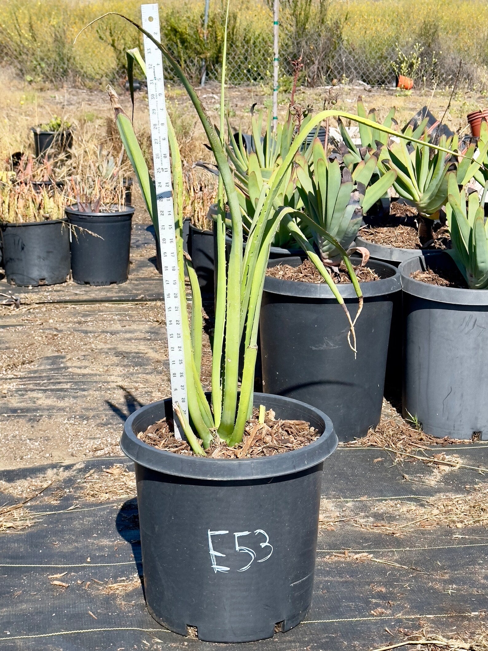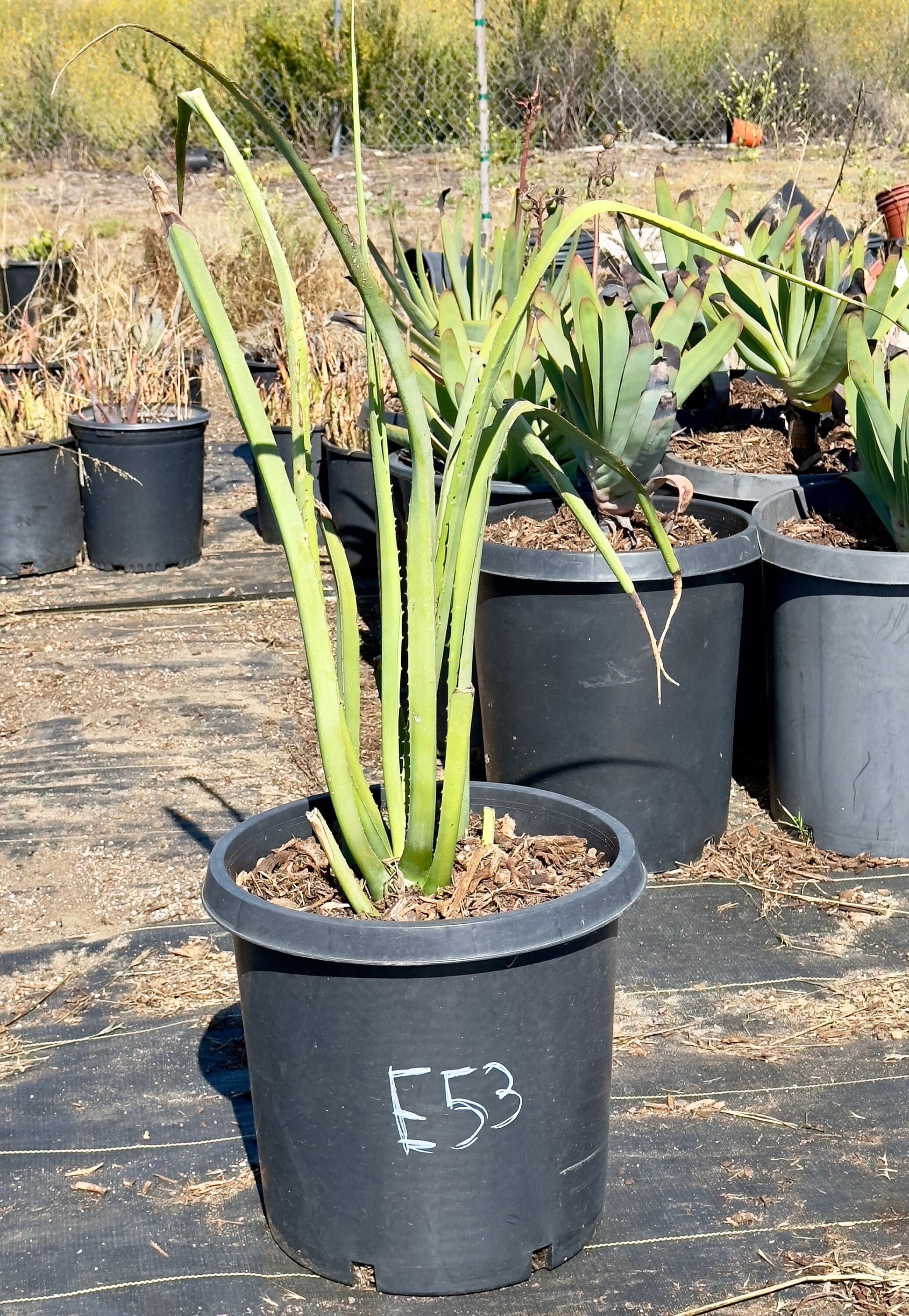 A large rosette forming succulent with stiff, 6-foot-long, dark green leaves. It also has hooked teeth growing at the top of an unbranched trunk that can be 8 feet tall or more - in habitat it can get up to over 20 feet and is considered the tallest of the Agave relatives. This plant typically flowers in cultivation when the trunk is 5 to 15 feet tall. When this plant blooms, it produces a spike that can rise an additional 20 feet, bearing greenish-white flowers and then produces bulbils (plantlets) at the flower base - these bulbils perpetuate this plant's life as it is monocarpic and the main plant dies after flowering. This is one of the most spectacular and dramatic plants in the Agave family. It has a limited distribution from 2,600 to 3,300 feet in dry thorn forests in calcareous soils near Puebla in Oaxaca, Mexico. Plant in full sun and irrigate little or not at all - a very dry growing plant. Hardy zones 9-11.