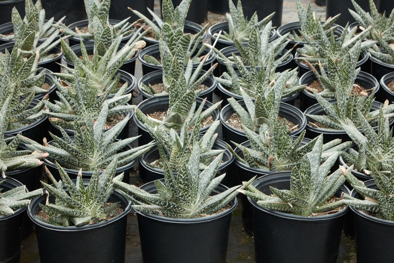 The Gasteria acinacifolia is a striking succulent known for its long, sword-shaped leaves that are deep green, often marked with subtle lighter spots, and arranged in a rosette pattern that gives it a bold architectural look. This species can grow impressively large for a Gasteria, reaching up to 24–36 inches tall and 24 inches wide, making it one of the largest in its genus. It thrives in bright, indirect light to partial shade, preferring well-draining soil and low to moderate water, making it easy to care for and highly drought-tolerant. During late spring to summer, it produces tall flower stalks with clusters of tubular, coral-pink and green flowers that attract pollinators and add vibrant seasonal color. Perfect for both containers and xeriscape gardens, it is a hardy, slow-growing plant that brings texture and elegance to any collection. USDA Hardiness Zones 9–11.