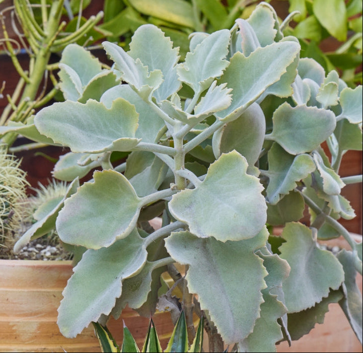 The Kalanchoe beharensis 'Roseleaf', also known as Velvet Elephant Ear, is a striking succulent with large, triangular, velvety leaves edged in soft pink hues, giving it a sculptural and dramatic appearance. This slow-growing plant can reach up to 3–4 feet tall and 3–5 feet wide, making it a bold statement piece for indoor or outdoor spaces. It thrives in bright, indirect sunlight to full sun and requires well-draining soil with low water needs, making it ideal for succulent gardens or xeriscaping. While it may bloom infrequently in cultivation, it produces tall clusters of small, tubular flowers in shades of pink or reddish-orange under optimal conditions, usually in late winter to early spring. Its unique texture, architectural form, and drought tolerance make it a standout addition to any collection. The 'Roseleaf' Kalanchoe prefers warm temperatures and minimal frost exposure, adding both beauty and resilience to your plant display. USDA Hardiness Zones 9–11.