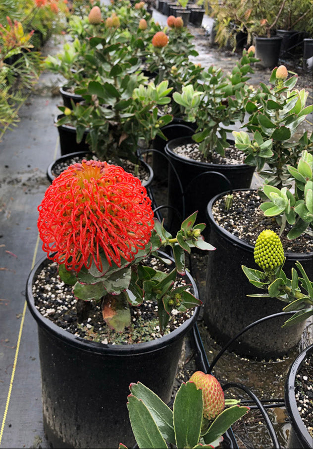 The Leucospermum 'Flame Giant', also known as the Pincushion Protea, is a spectacular evergreen shrub admired for its large, fiery orange-red blooms that resemble glowing pin cushions. Its silvery-green leaves form a dense, rounded shape that adds both texture and color contrast to any landscape. This vibrant variety can reach 6–8 feet tall and 6–10 feet wide, making it a bold centerpiece or a striking addition to mixed garden beds. Thriving best in full sun with well-draining, slightly acidic soil, it requires low to moderate water once established and is highly drought-tolerant. The 'Flame Giant' typically blooms in spring through early summer, with long-lasting flowers that attract hummingbirds and make stunning cut arrangements. Perfect for coastal or Mediterranean-style gardens, this plant offers year-round visual interest with minimal upkeep. USDA Hardiness Zones 9–11.