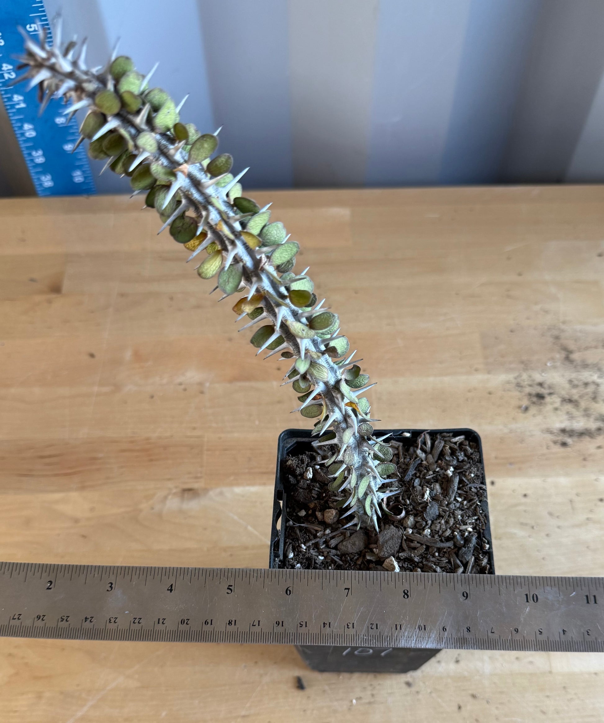 A striking upright succulent tree, the Madagascar Ocotillo features thick grayish-white stems adorned with small paired oval leaves and prominent spines that give it a sculptural form. When mature outdoors it can reach 25 – 40 feet tall and 4 – 6 feet wide, though in a container it remains compact and architectural. This drought-adapted plant thrives in full sun, loves fast-draining desert-style soil, and prefers very little water once established—allowing the soil to dry completely between deep irrigations. Rare greenish-yellow flowers may appear on mature specimens in late spring to mid-summer. Ideal for tropical and arid gardens or as a dramatic potted specimen, it is hardy to USDA Zones 9 B – 11.