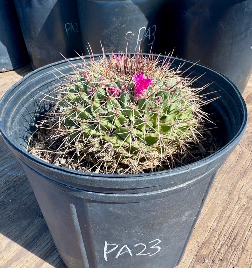 Mammillaria melanocentra is a striking and collectible cactus known for its spherical to slightly cylindrical shape, pronounced tubercles, and dramatic central spines that range from dark reddish-brown to black. Its white radial spines create a soft visual contrast, while its bright pink to red flowers bloom in a halo around the crown, adding vivid color during the growing season. This slow-growing cactus typically reaches up to 6 inches tall and 4 inches wide, making it ideal for pots or small succulent arrangements. Native to arid regions, it thrives in full sun to partial shade and prefers gritty, well-draining soil. Water sparingly—only when the soil has completely dried out—to prevent rot, especially in cooler months. It’s a great choice for indoor cactus gardens or warm outdoor climates in USDA zones 9–11.