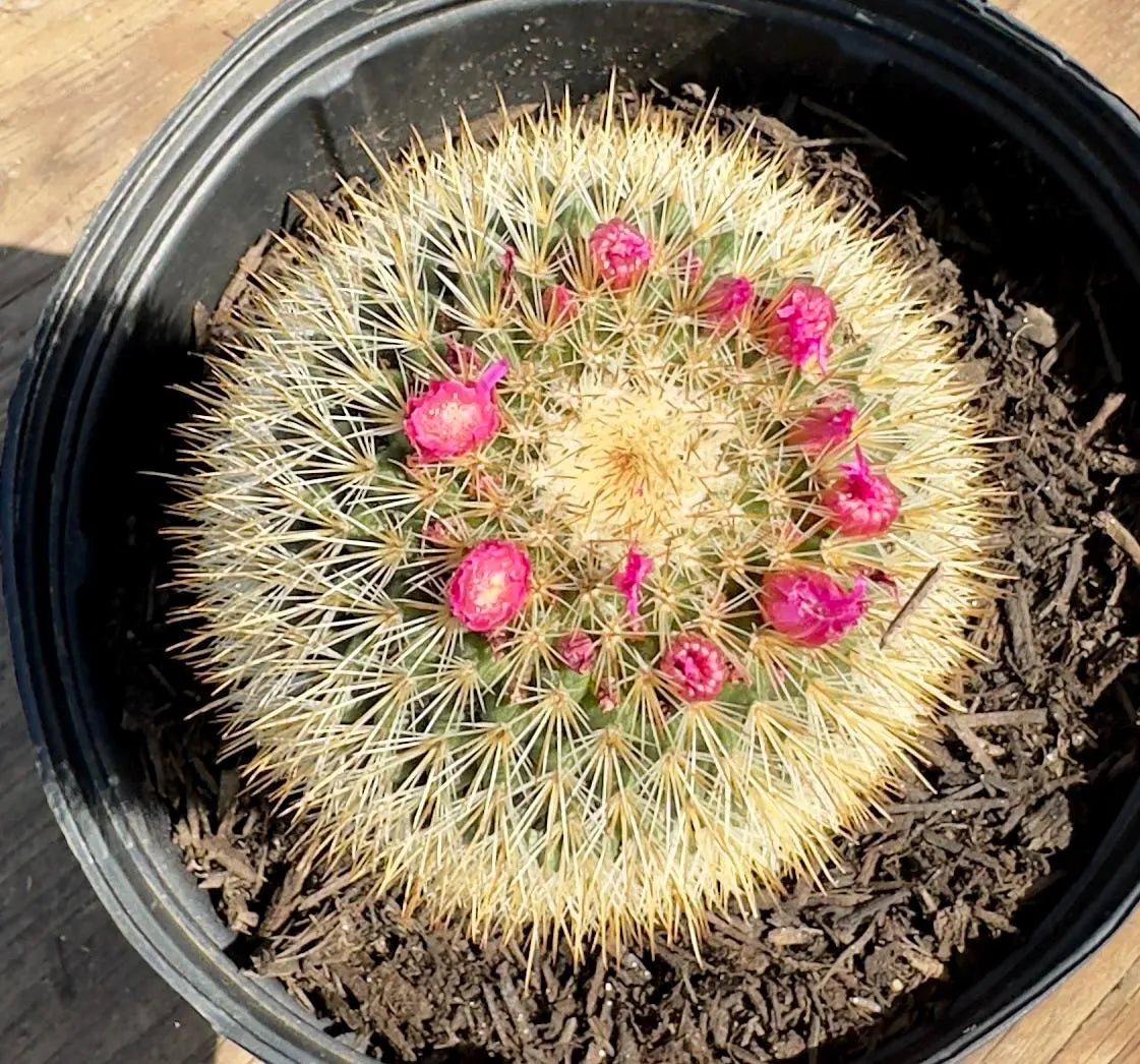 Not sure about the exact identification of this Mammillaria: Mammillaria is a charming and compact cactus genus known for its dense clusters of small, round stems covered in delicate spines and soft, woolly tufts. Many varieties bloom with vibrant, crown-like rings of pink, red, or white flowers that add seasonal interest and charm to any succulent collection. Most Mammillarias stay small, typically growing 4–6 inches tall and about 4 inches wide, making them ideal for indoor pots, windowsills, or mixed desert arrangements. This cactus thrives in bright, indirect light to full sun and prefers gritty, well-draining soil. It’s drought-tolerant and should be watered sparingly, especially during winter dormancy.