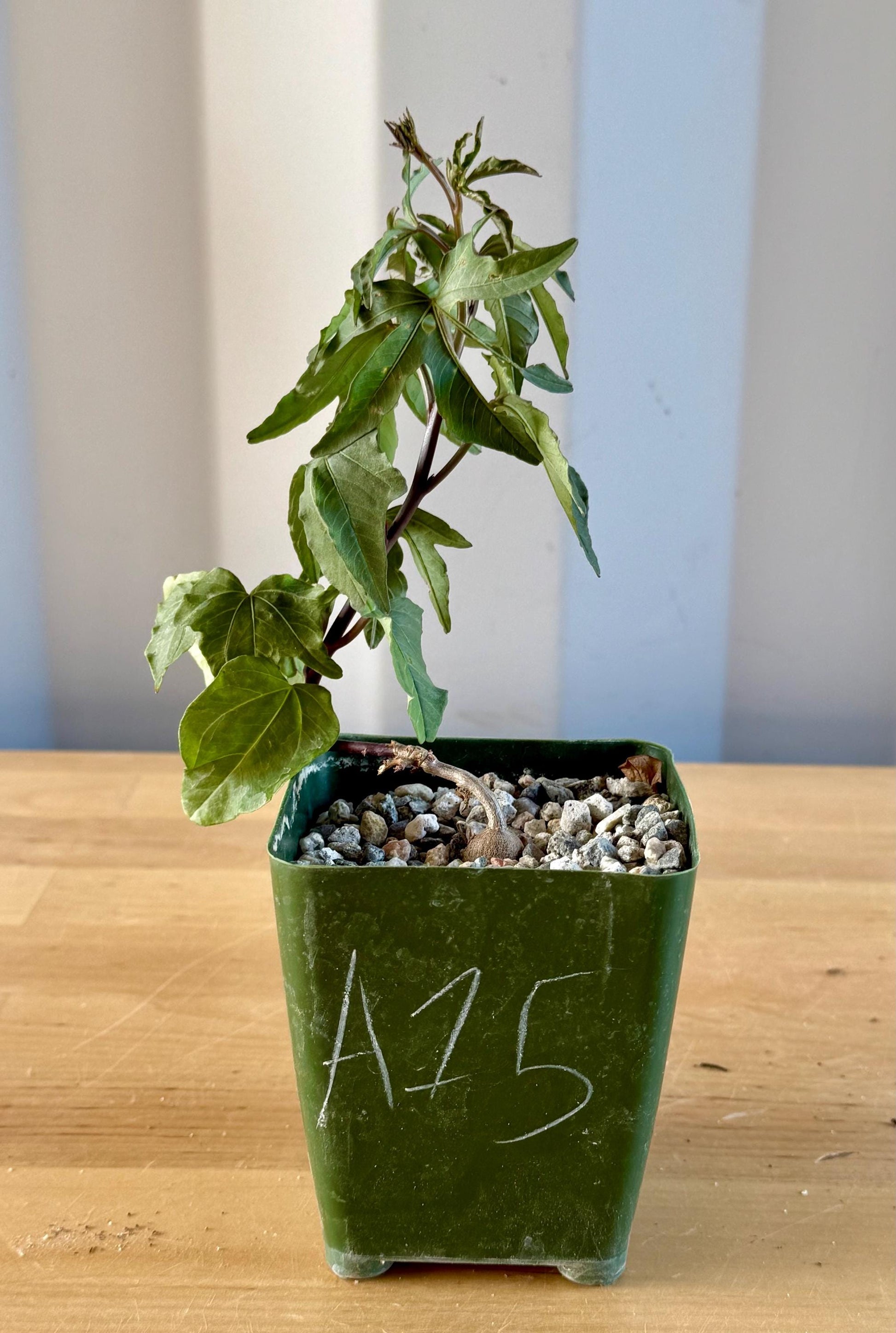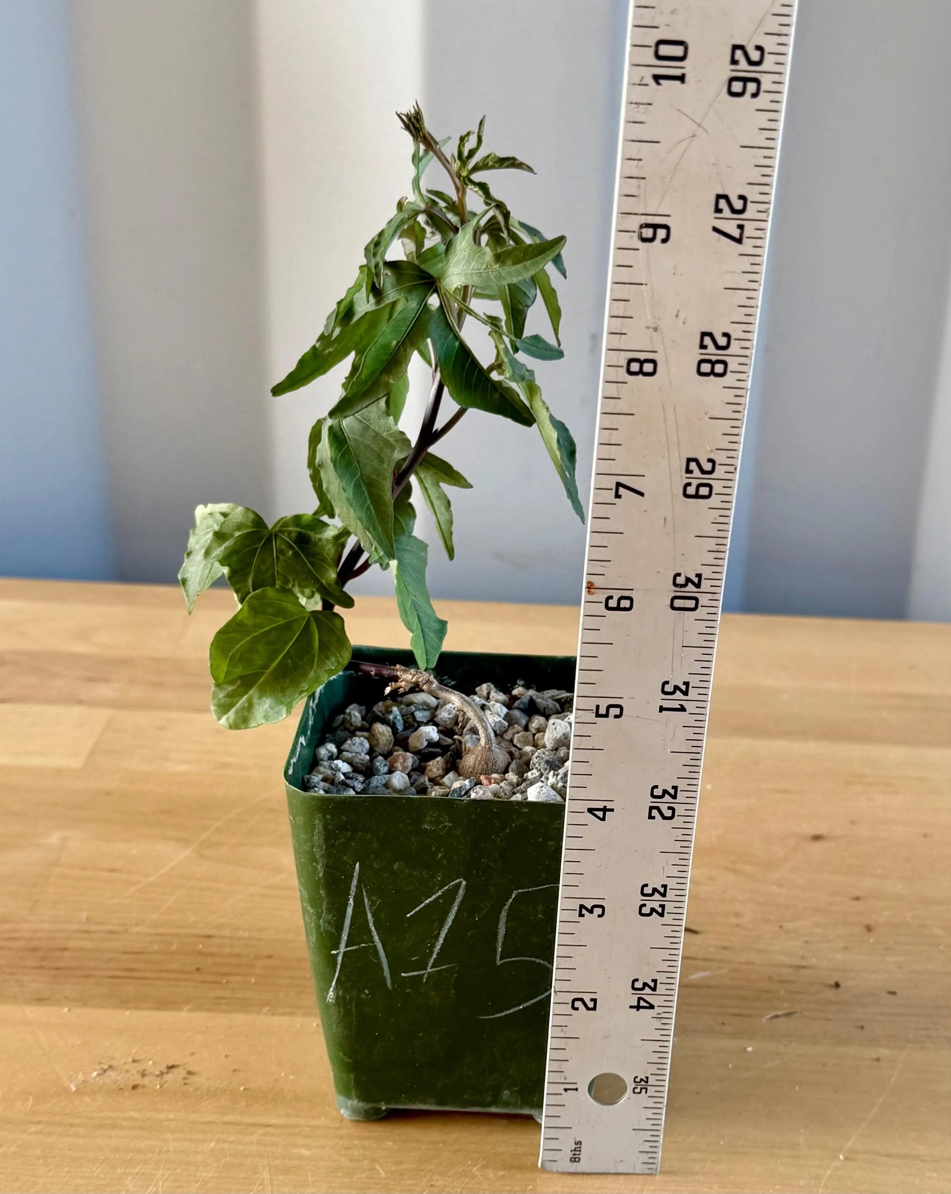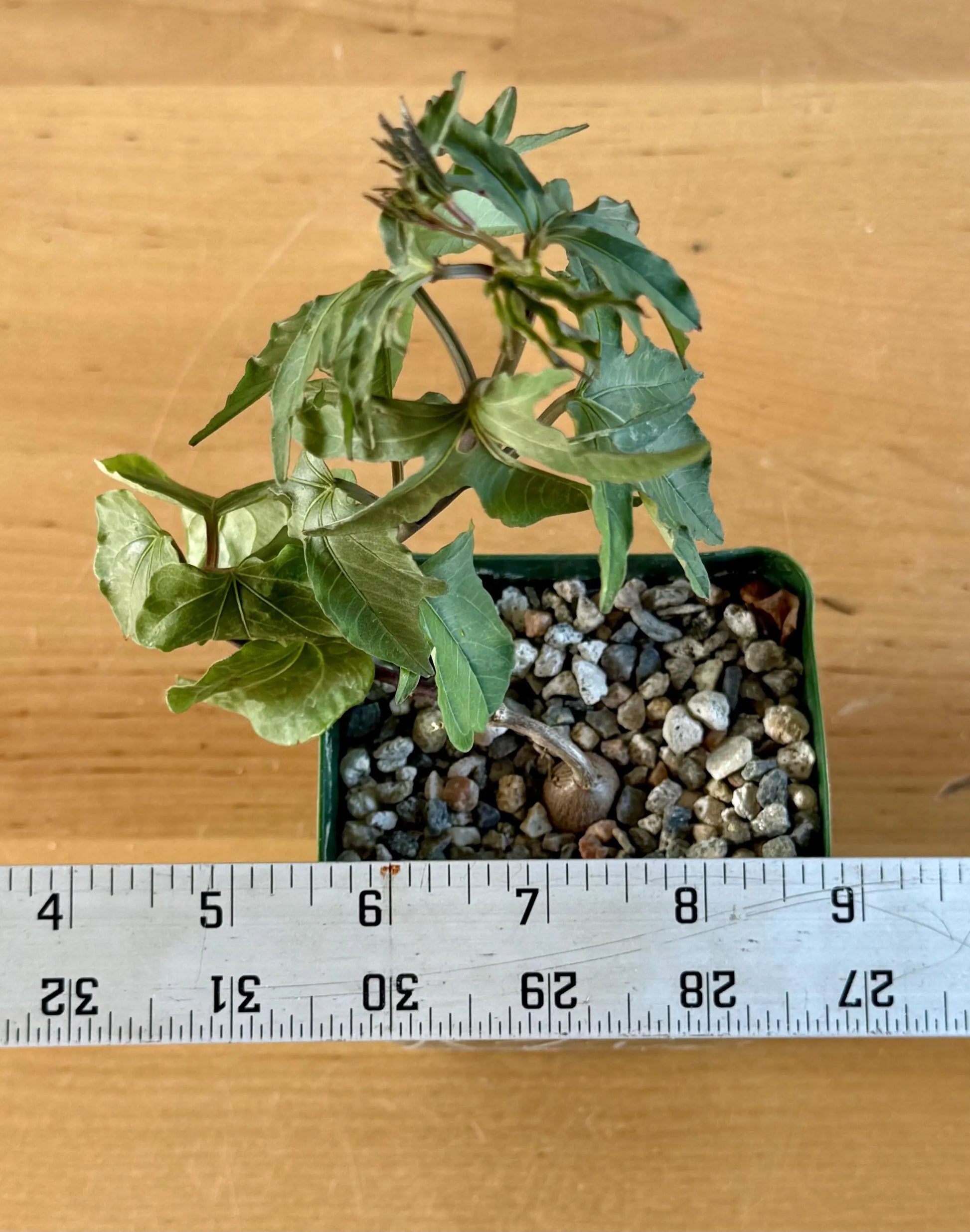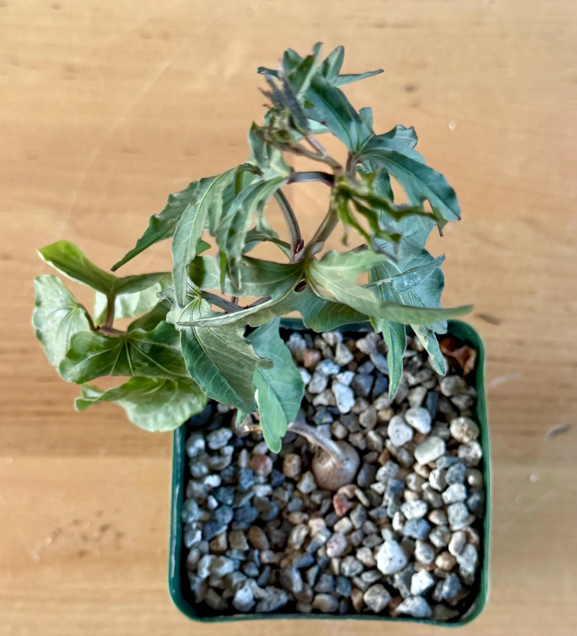 Ipomoea platensis is a rare, caudiciform morning glory prized for its swollen, woody base (caudex) and vining, deciduous stems with attractive green leaves. The thickened caudex can grow into an eye-catching, sculptural form over time, while the vines produce beautiful purple, funnel-shaped flowers during the growing season. In cultivation, the caudex can reach up to 12 inches wide, with vines stretching several feet when actively growing. This plant loves full sun to partial shade, requires excellent drainage, and prefers infrequent deep watering during its growing period. It naturally goes dormant in winter, dropping its leaves while the caudex remains an architectural focal point. Ipomoea platensis is ideal for collectors of caudiciforms and bonsai-style succulent plants. Perfect for pots, patio displays, or indoor growers with bright light.