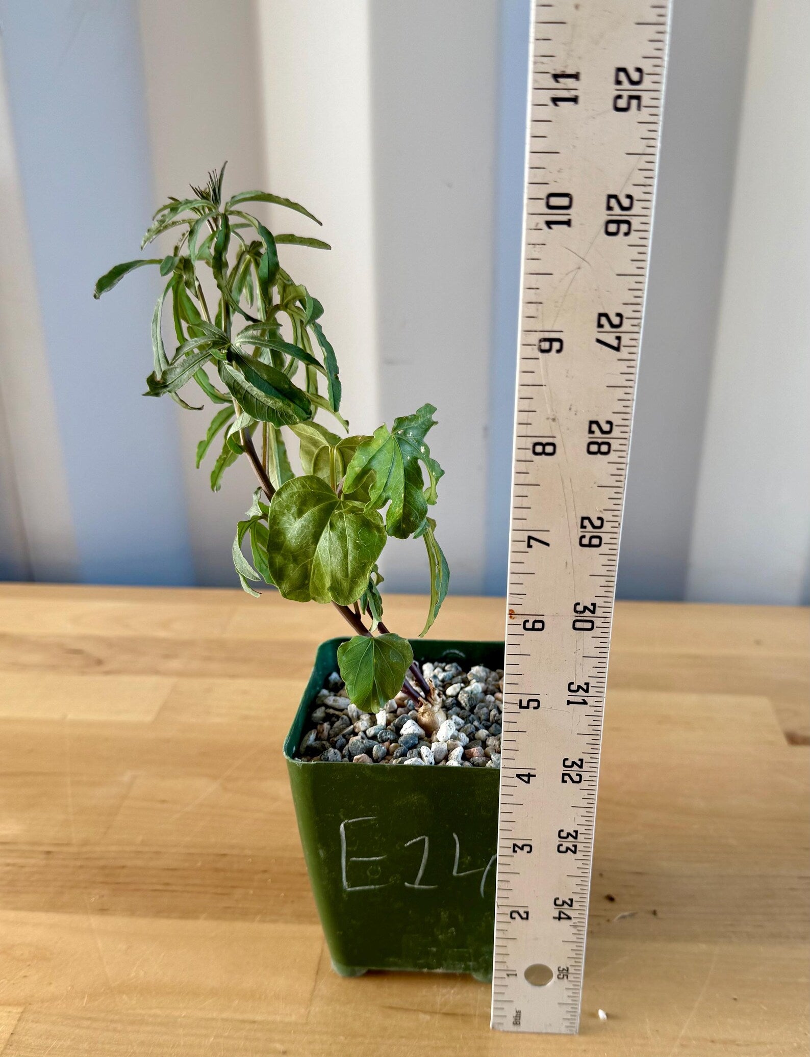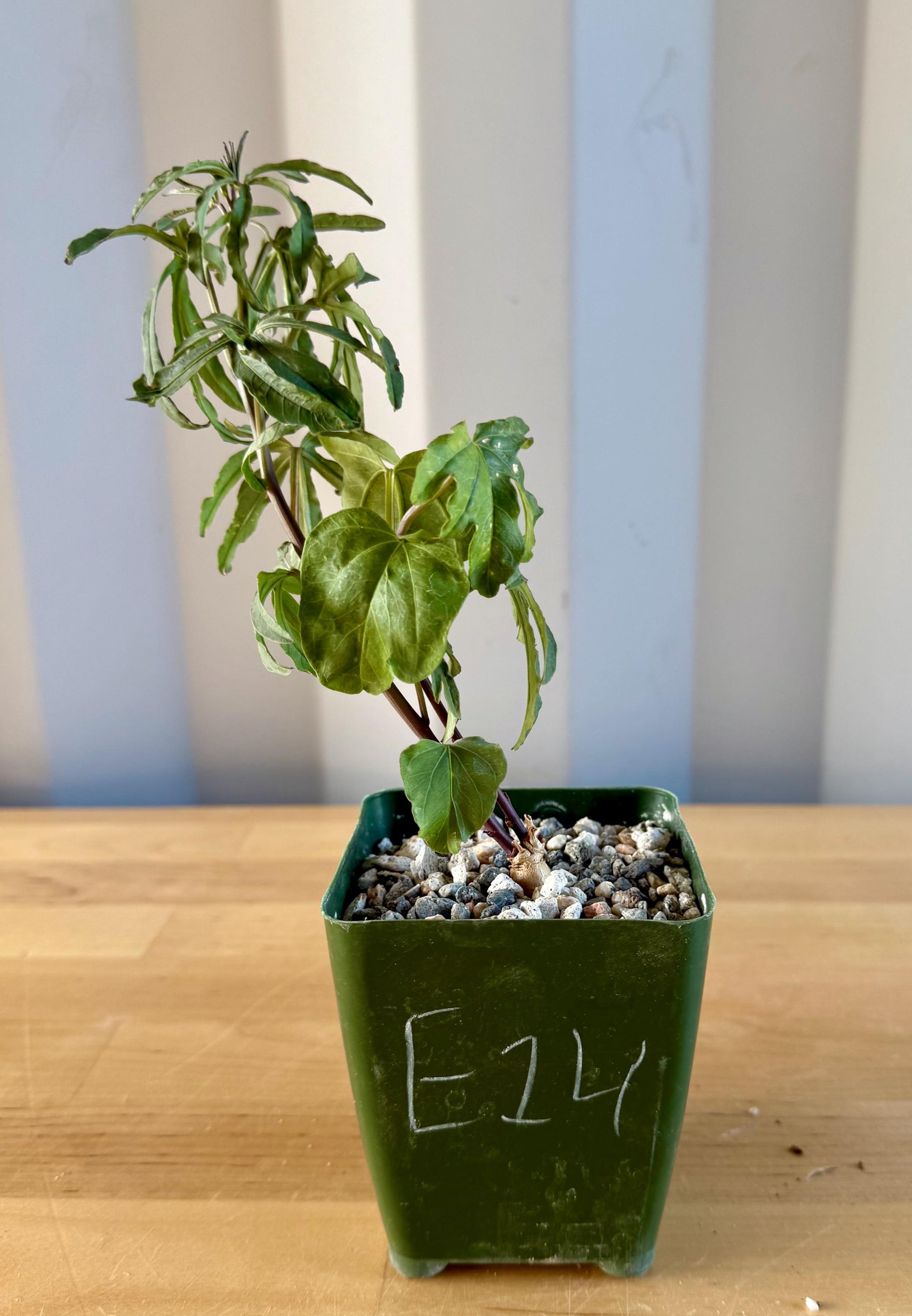 Ipomoea platensis is a rare, caudiciform morning glory prized for its swollen, woody base (caudex) and vining, deciduous stems with attractive green leaves. The thickened caudex can grow into an eye-catching, sculptural form over time, while the vines produce beautiful purple, funnel-shaped flowers during the growing season. In cultivation, the caudex can reach up to 12 inches wide, with vines stretching several feet when actively growing. This plant loves full sun to partial shade, requires excellent drainage, and prefers infrequent deep watering during its growing period. It naturally goes dormant in winter, dropping its leaves while the caudex remains an architectural focal point. Ipomoea platensis is ideal for collectors of caudiciforms and bonsai-style succulent plants. Perfect for pots, patio displays, or indoor growers with bright light.
