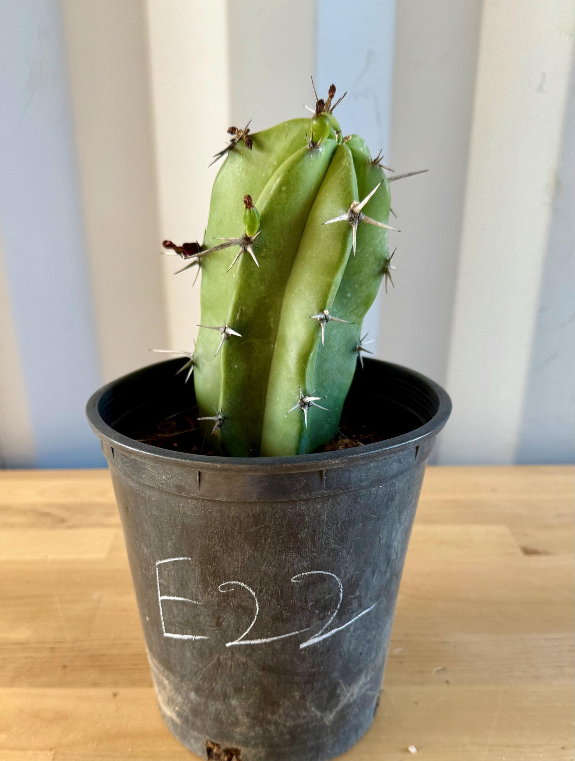 Myrtillocactus geometrizans, commonly known as the Blue Myrtle or Blue Candle Cactus, is a striking columnar cactus featuring blue‑green, ribbed stems that branch into a candelabra‑like form. It can grow into an impressive shrubby tree reaching 10–20 ft tall (typically 4–6 m) with several slender trunks. The plant blooms in spring and summer, producing small, creamy‑white flowers followed by edible blueberry‑like dark purple fruits. Thriving in full sun with well‑draining, gritty soil, it’s extremely drought‑tolerant but appreciates deep watering during active growth and tolerates light frost to around 25 °F Hardy in USDA zones 9–11, this fast‑growing cactus is ideal for xeriscapes, large containers, or as a dramatic statement piece in any succulent collection.