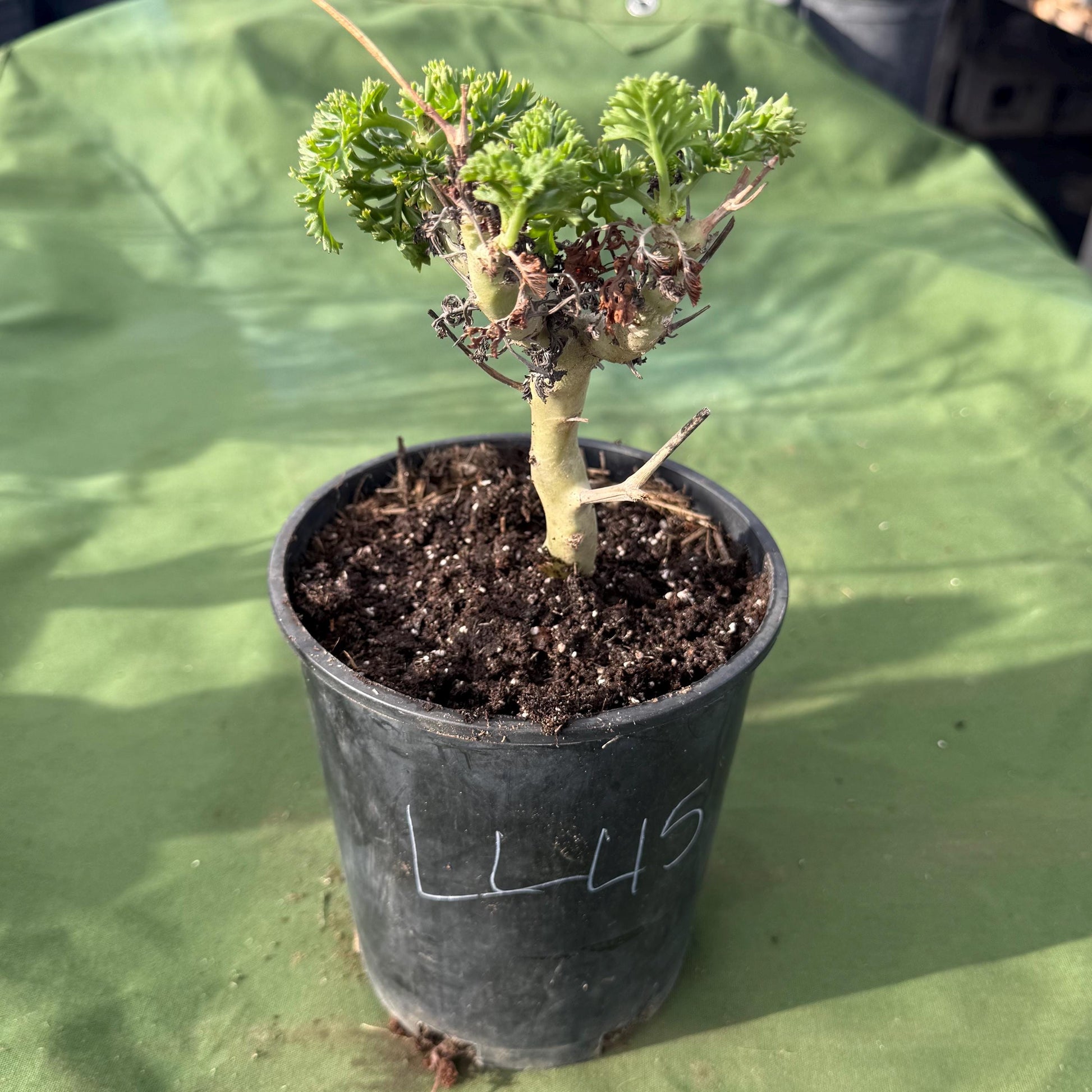 Pelargonium carnosum, commonly known as the Fleshy Stalk Pelargonium, is a distinctive succulent native to South Africa. It features thick, knobby, gray-green stems and fern-like, feathery leaves up to 8 inches long. Mature plants typically reach heights of 1 to 2 feet, with a similar spread. This drought-tolerant species thrives in full sun to partial shade and prefers well-drained soil with minimal watering. It is best suited for USDA Hardiness Zones 10a to 11.