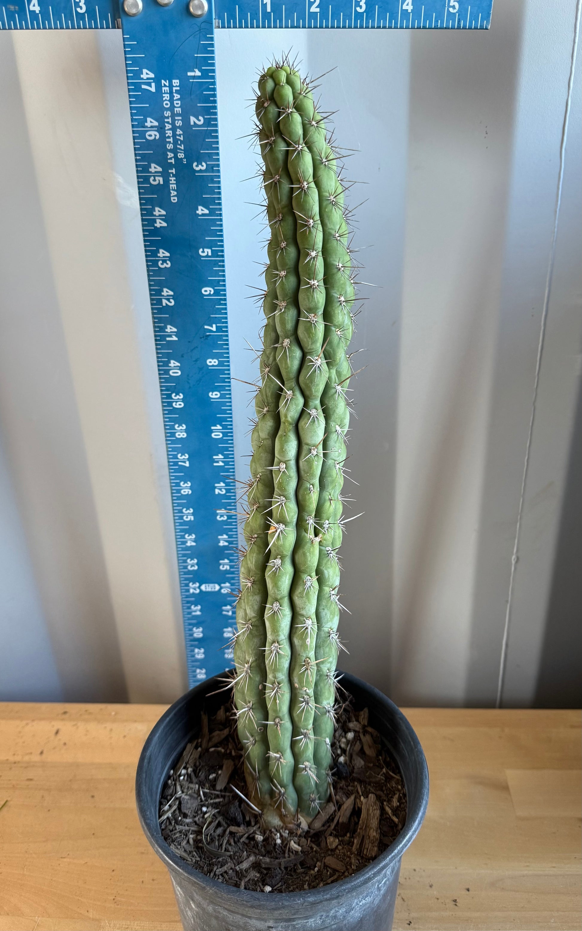 This striking columnar cactus features thick blue-green stems adorned with prominent vertical ribs and dramatic tan-to-gray spines, culminating in bold white funnel-shaped blooms at maturity. Mature plants can reach heights of 10-25 ft tall and widths of 3-6 ft. It thrives in full sun with very well-draining soil and low water needs once established, making it an ideal drought-tolerant specimen. Best suited for outdoor planting in USDA Hardiness Zones 9a–11.