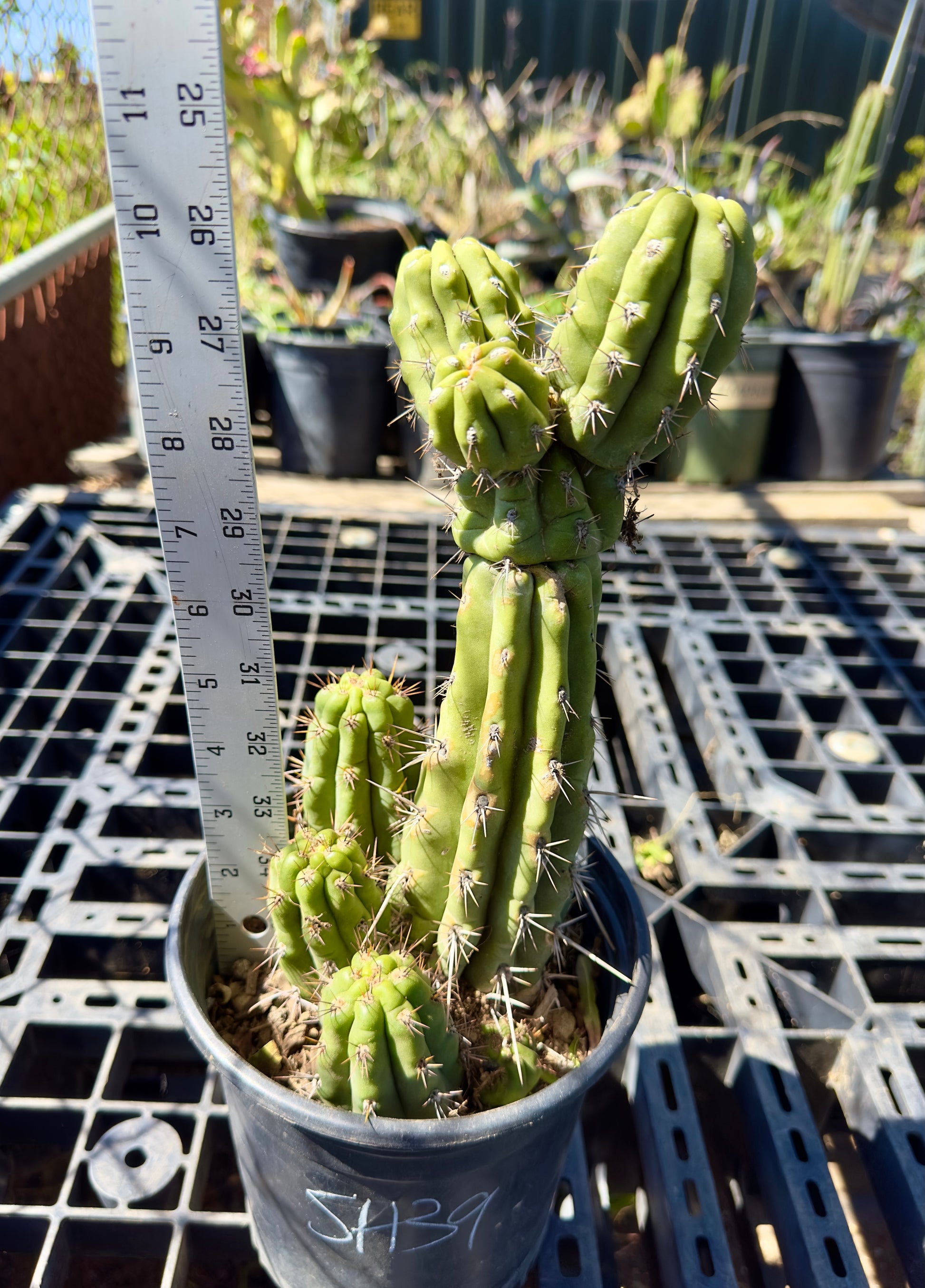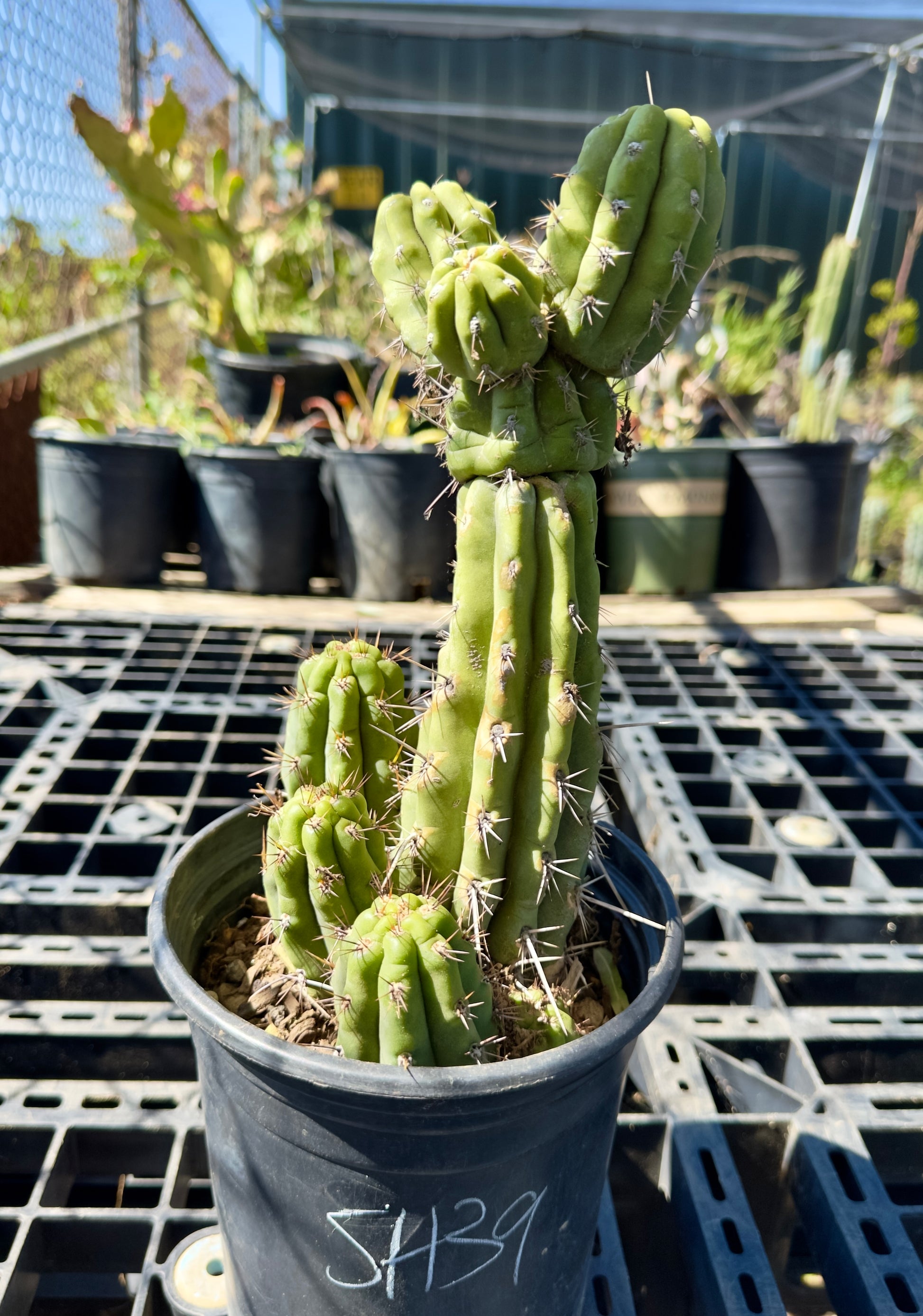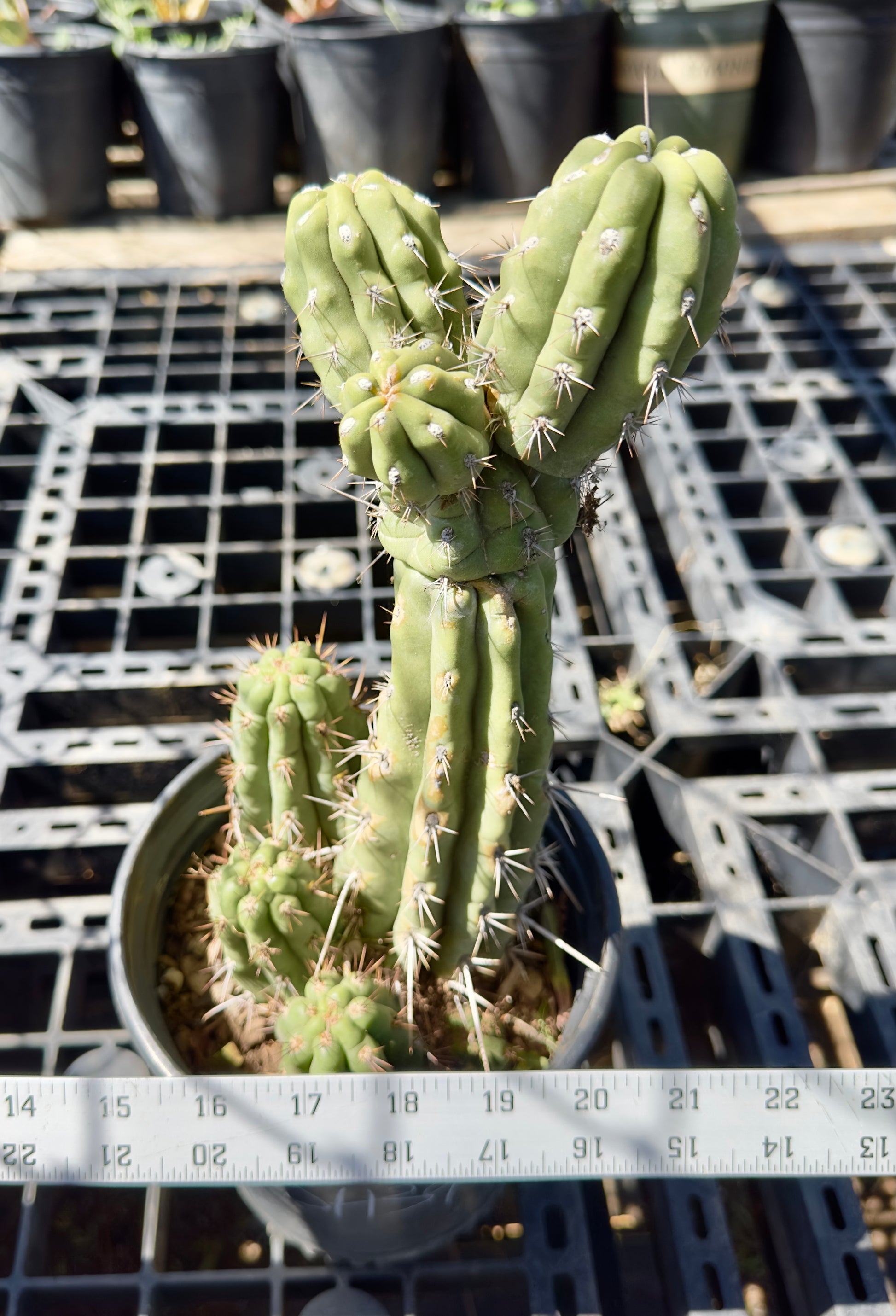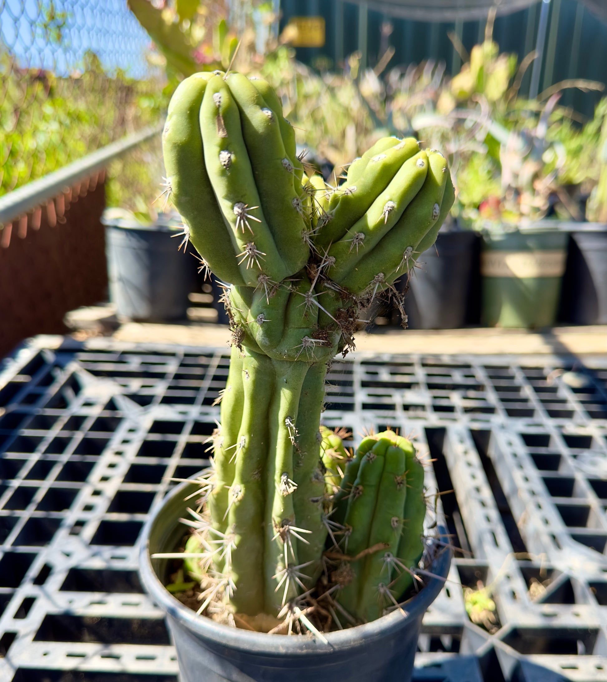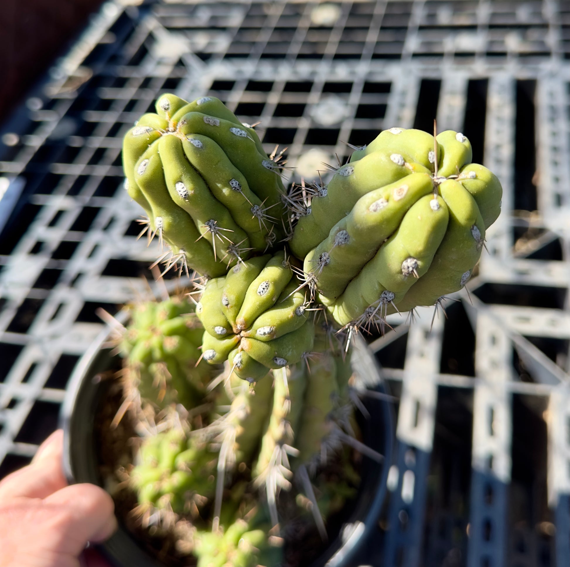 Verne's Glaucus is a captivating cultivar of Trichocereus peruvianus, renowned for its striking powdery blue stems and pronounced ribbing. This columnar cactus showcases a distinctive glaucous hue, making it a standout addition to any succulent collection. In cultivation, it can reach heights of up to 6 feet (1.8 meters), with mature specimens displaying a robust, upright growth habit. Thriving in full sun, Verne's Glaucus prefers well-draining soil and requires minimal watering—allowing the soil to dry completely between waterings—to prevent root rot. It's well-suited for USDA Zones 9b to 11, tolerating temperatures down to 25°F (–3.9°C) when kept dry. This low-maintenance cactus is ideal for xeriscaping, desert gardens, or as a striking container plant, offering both visual appeal and resilience.